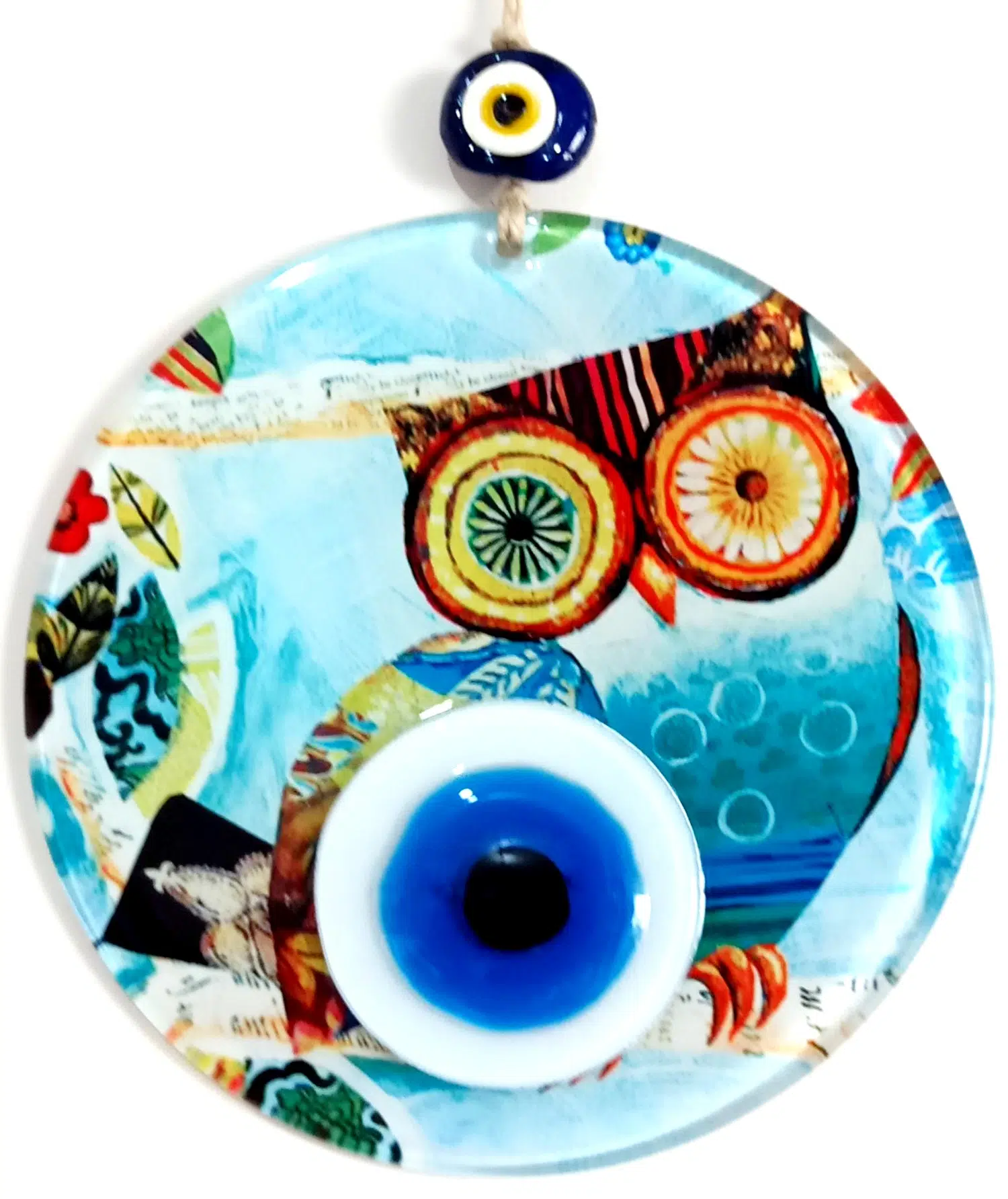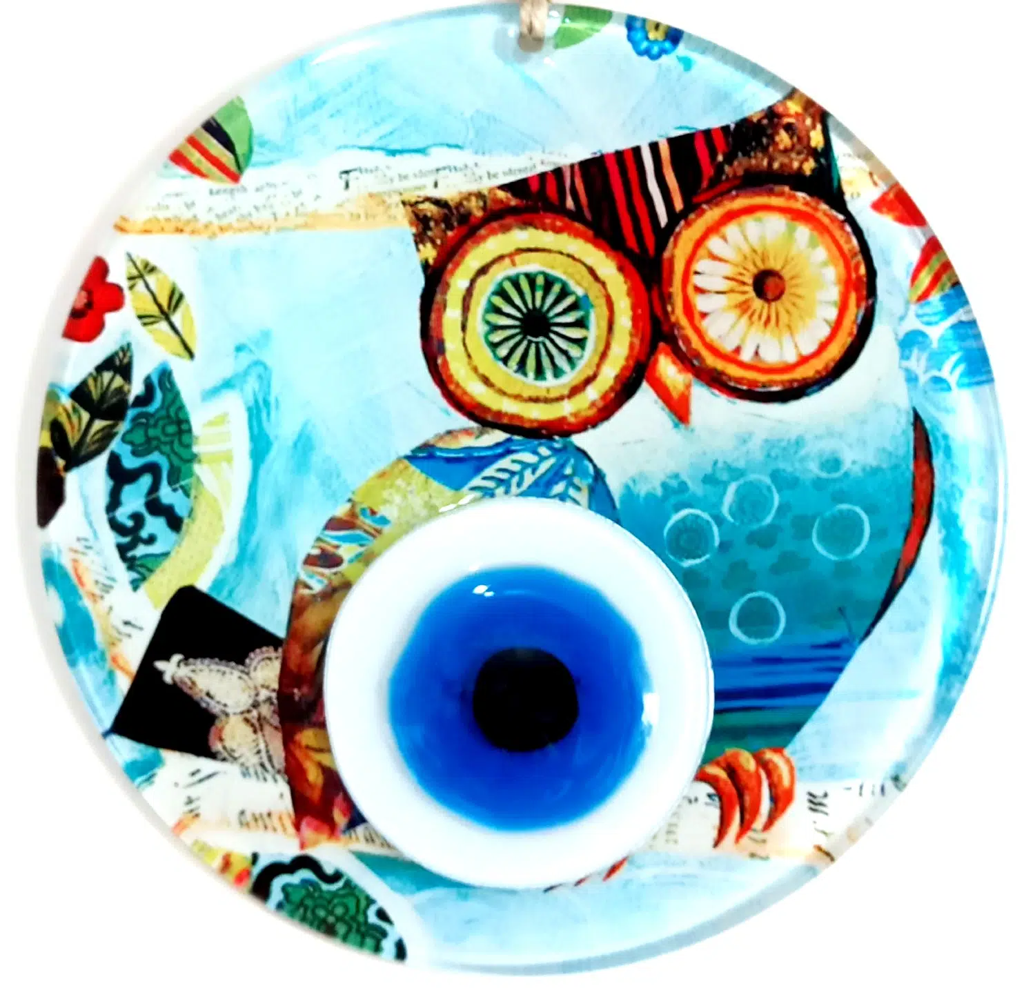 Bilgin baykuş nazar boncuklu duvar süsümüz 16 santimetre çapındadır. Ürünümüz füzyon camdan üretilmiştir.