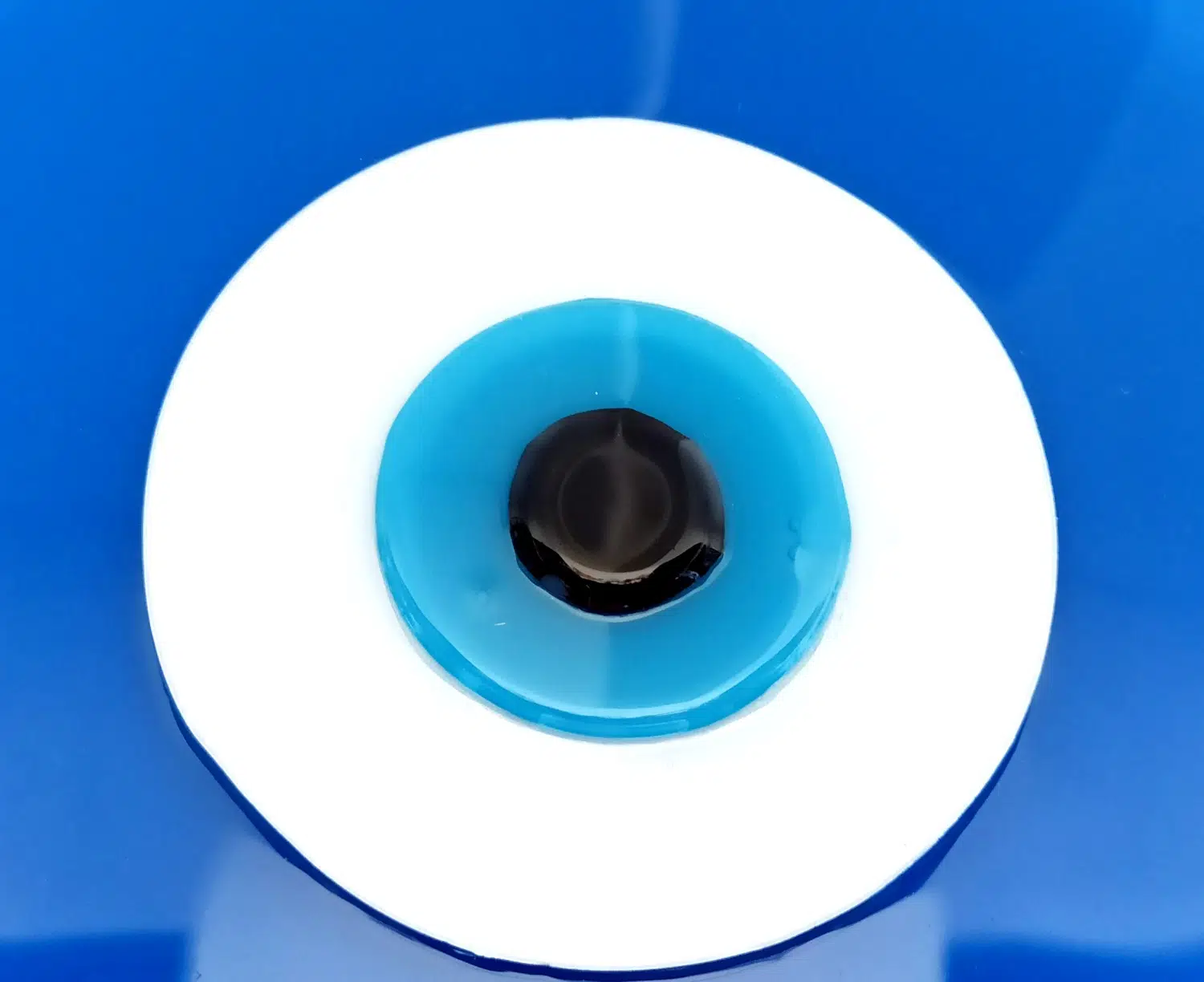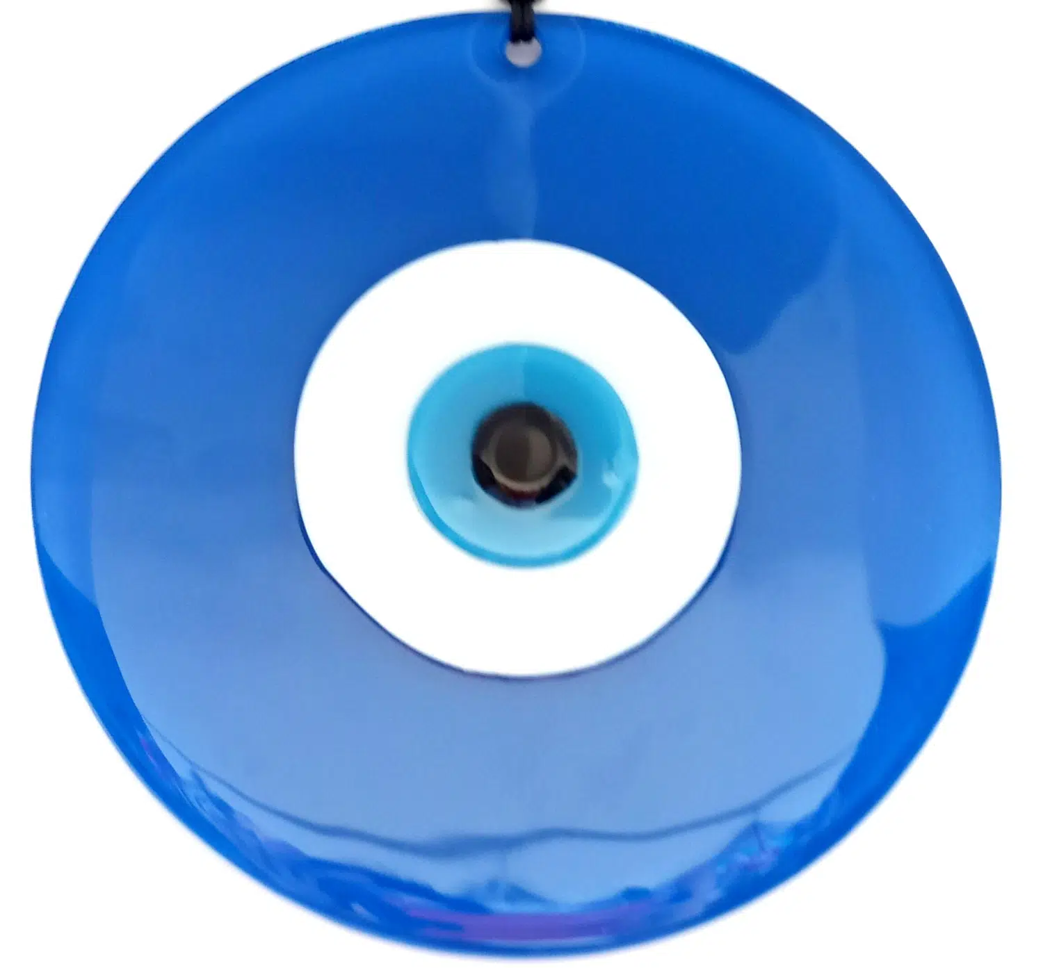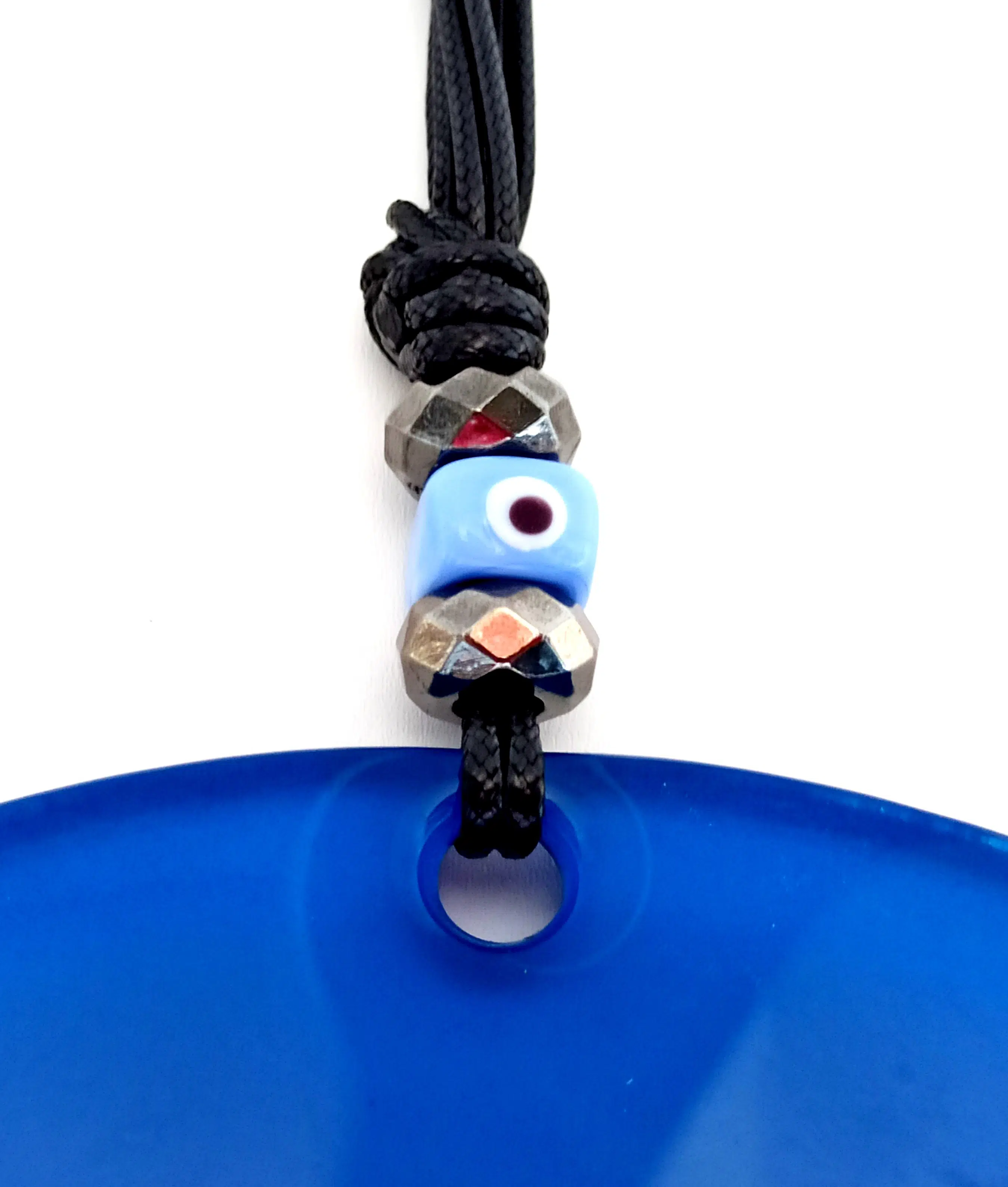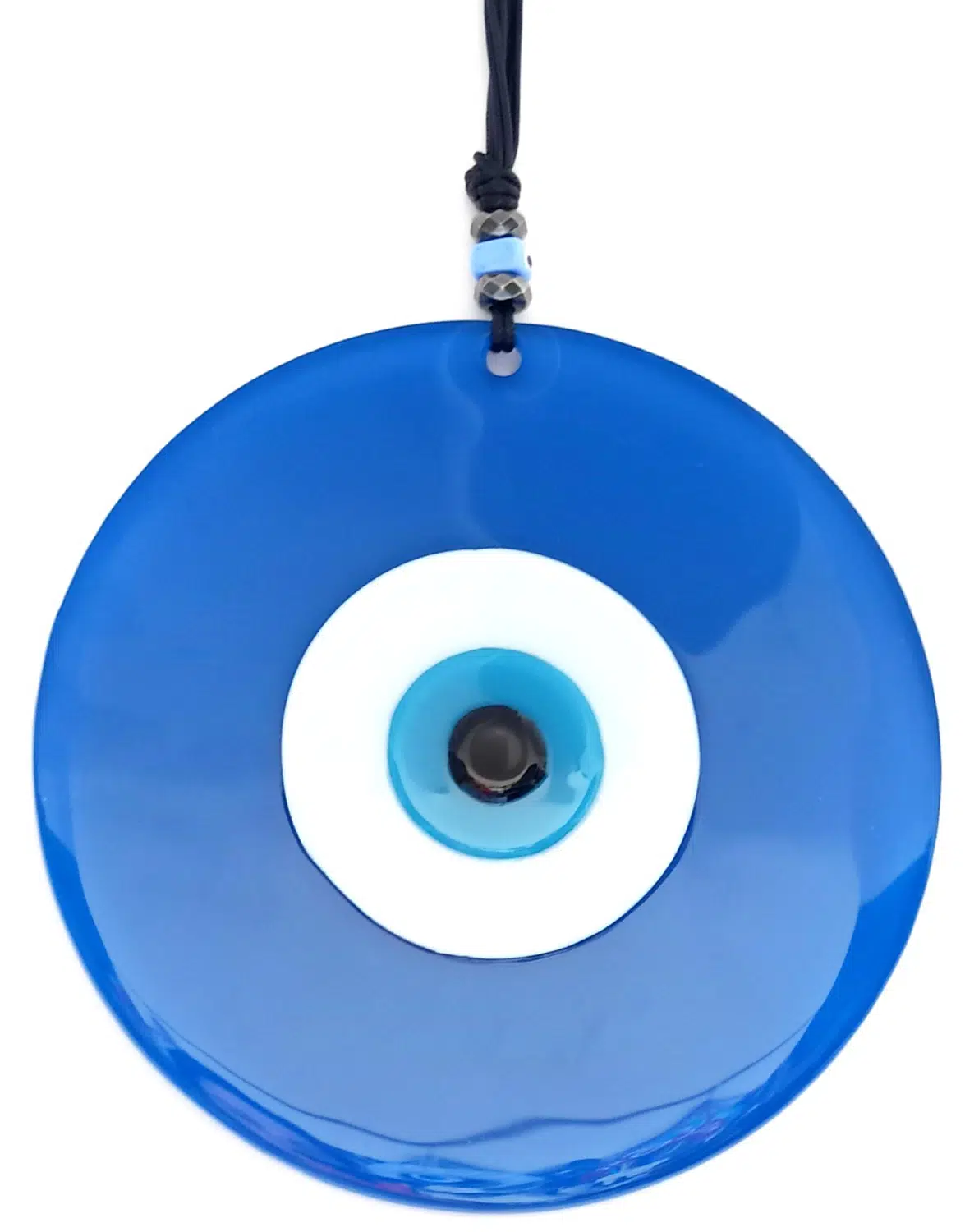 Mavi renk nazar boncuklu deri ipli ürünümüz tamamen el işçiliği ile üretilmiştir. 8 mm kalınlığında birinci kalite camla üretilmiştir. Cam duvar süsümüz 20 santimetre çapındadır. Ürünümüz ip dahil 32 santimetre boyundadır.