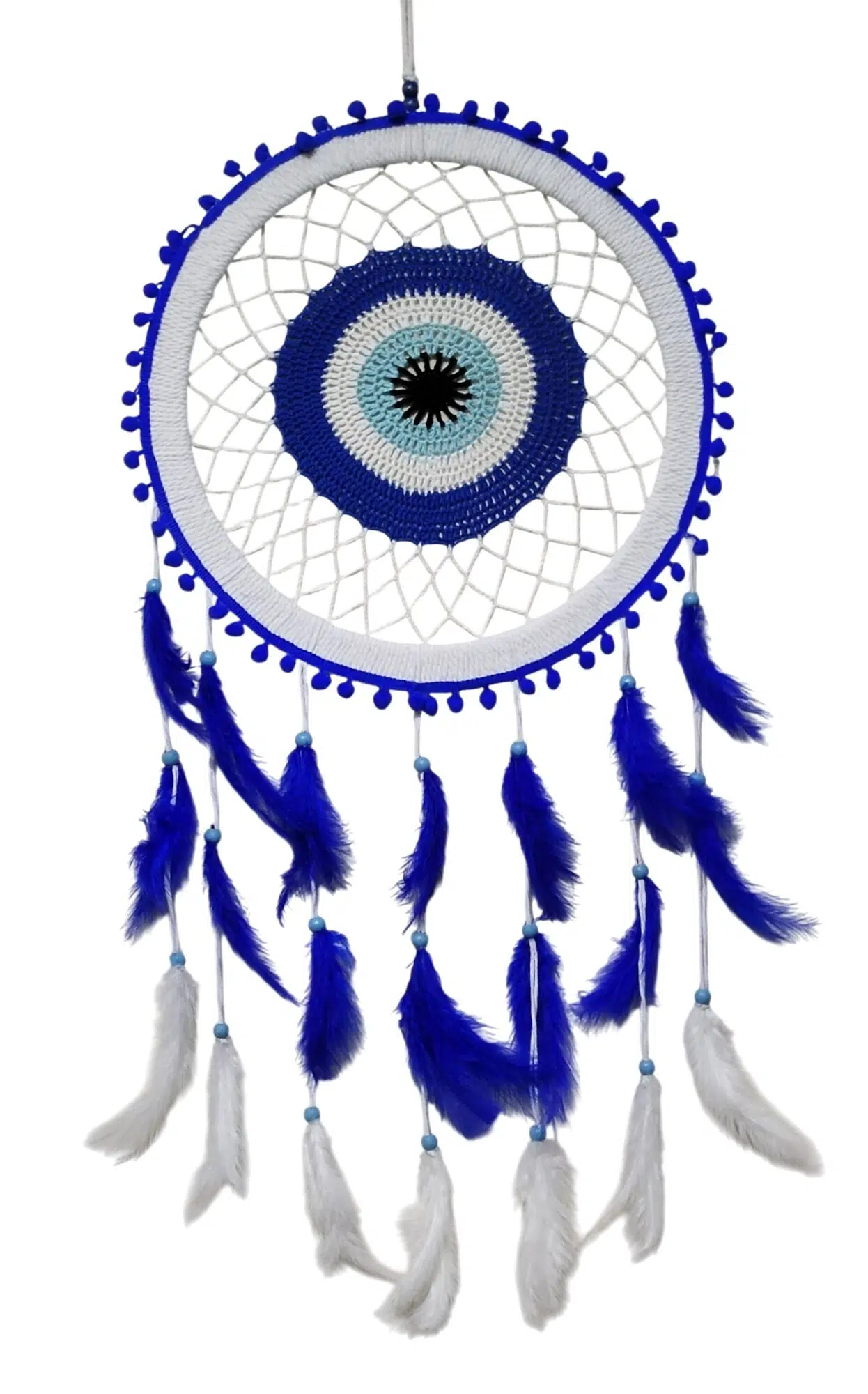 Geleneksel Kızılderili rüya yakalayıcı (dream catcher) ile Türk kültüründe nazardan koruduğuna inanılan mavi nazar boncuğunun muhteşem birleşimi! Bu özel tasarım duvar süsü, hem dekoratif bir şıklık katıyor hem de negatif enerjilerden ve kötü rüyalardan koruma sağlıyor.