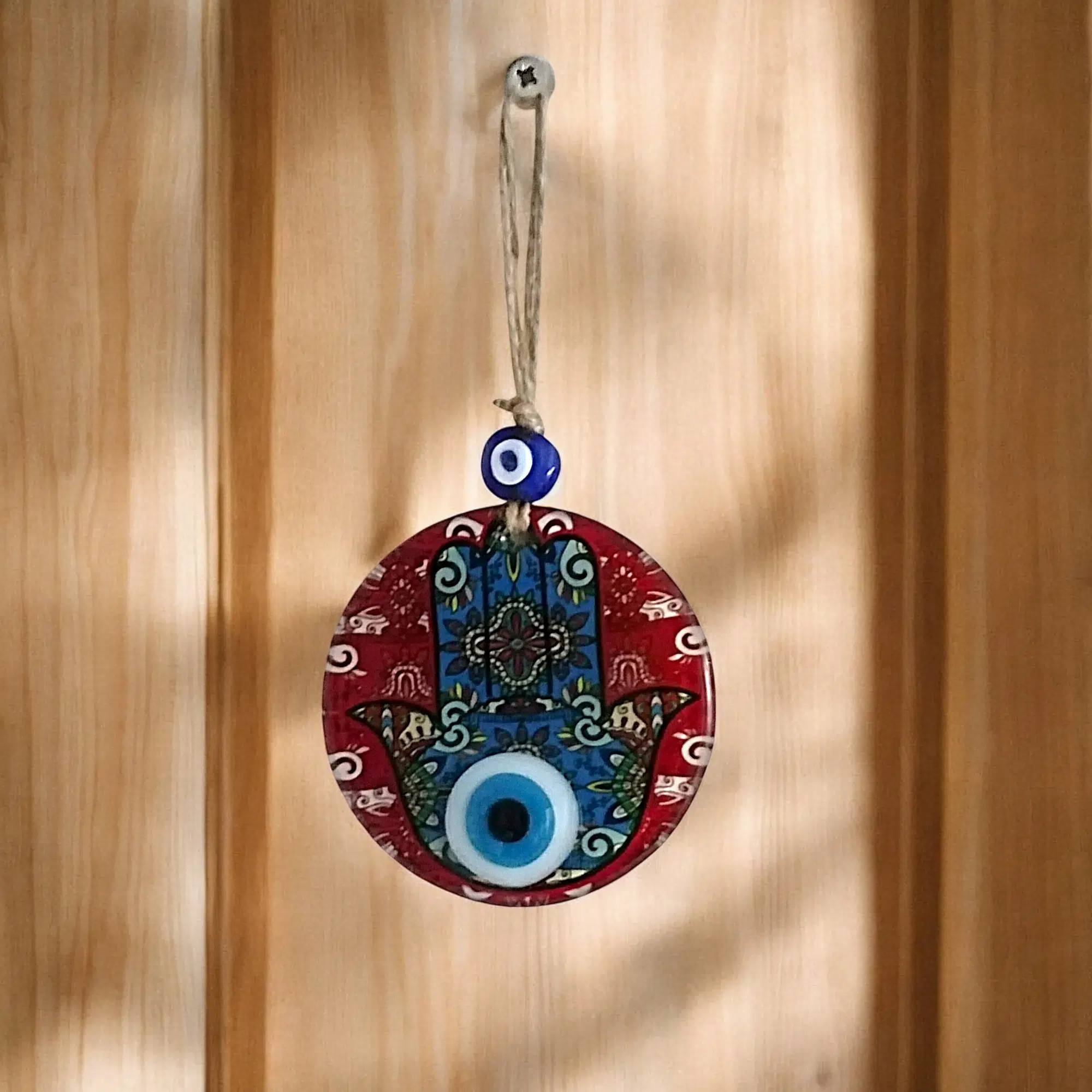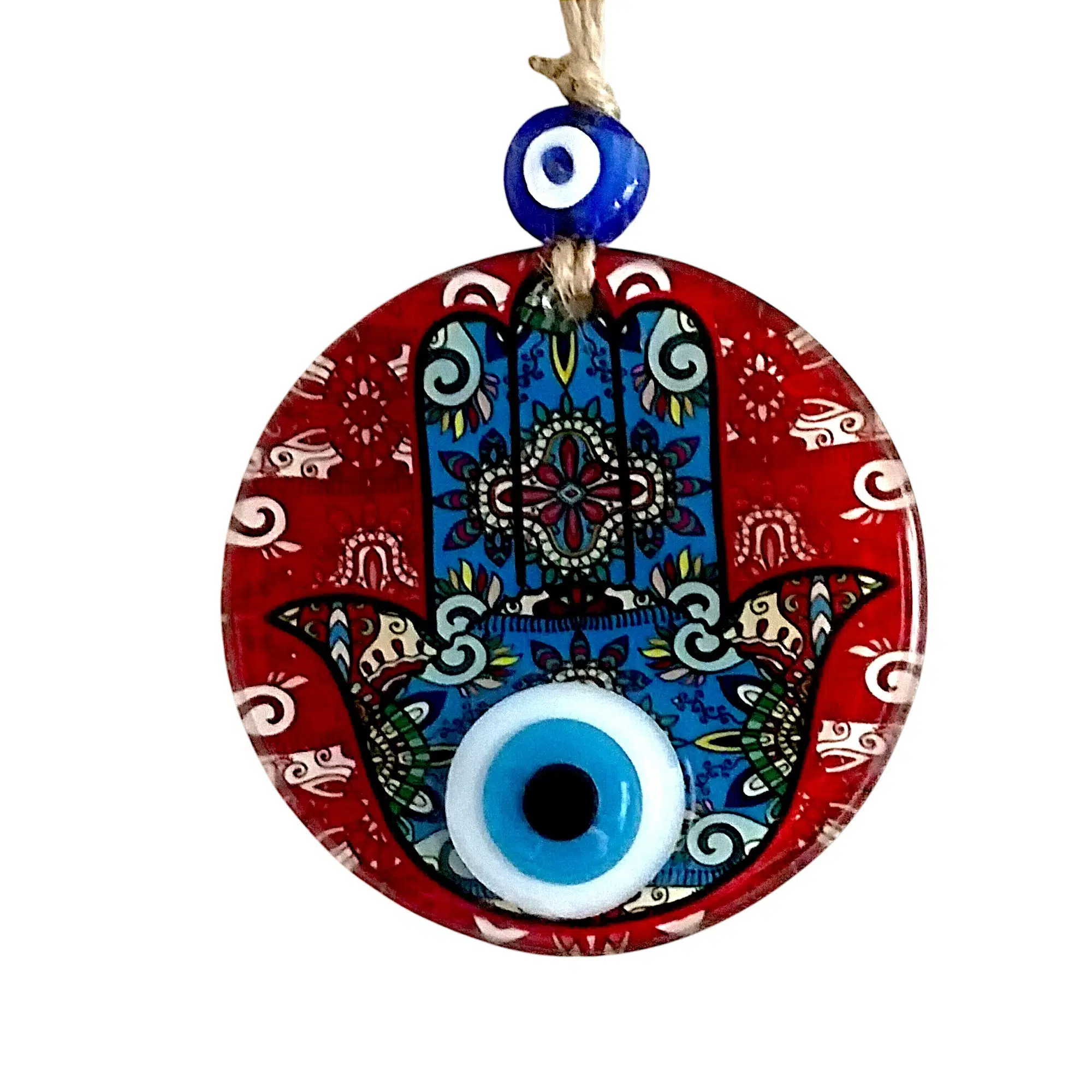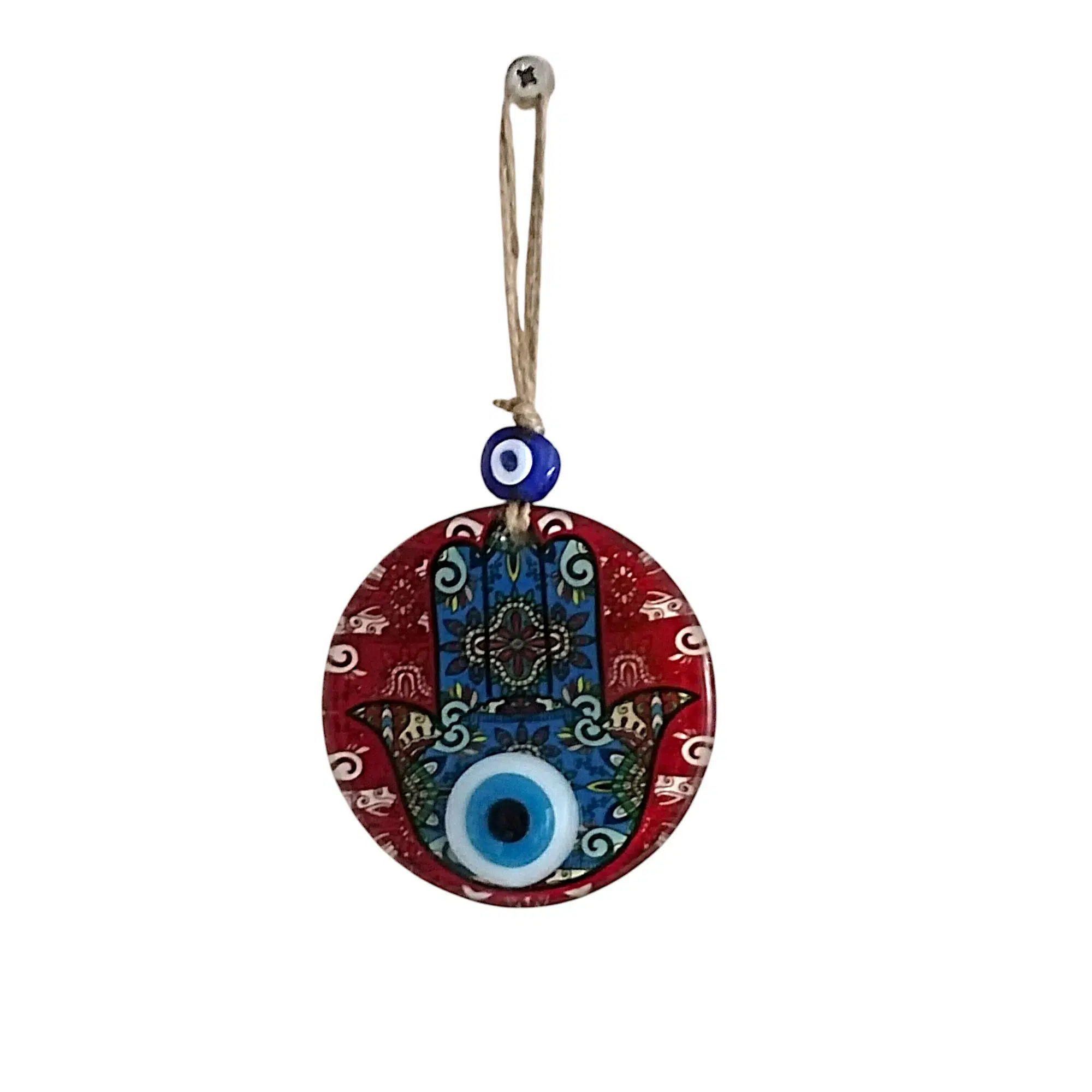 Mini boy Fatma Ana eli cam füzyon Kırmızı renk nazar boncuklu duvar süsümüz tamamen el işçiliği ile üretilmiştir. Tasarım harikası el yapımı nazar boncuklu duvar süsümüz 10 santimetre çapındadır. Ürünümüz ip dahil 23 santimetre boyundadır.