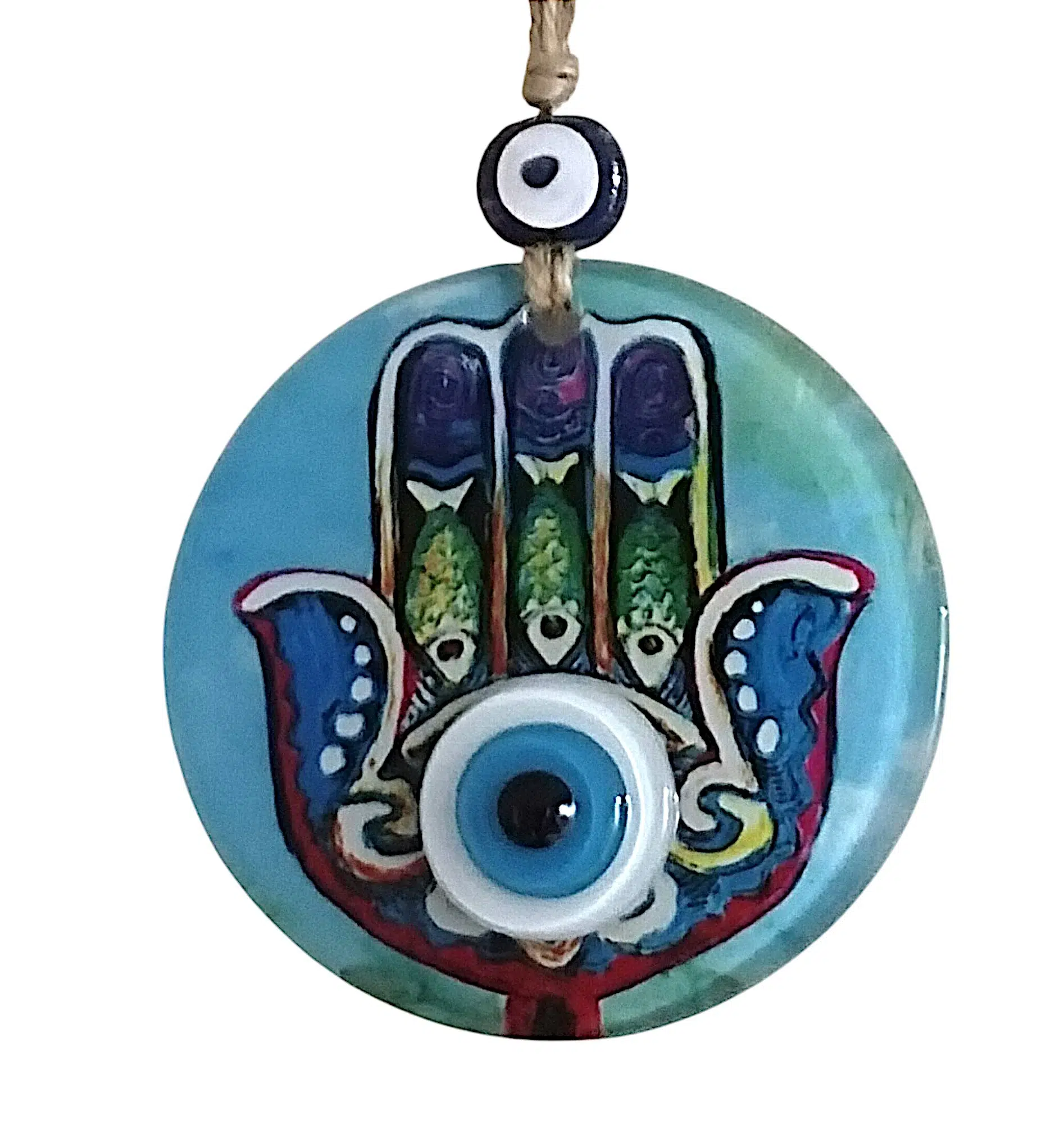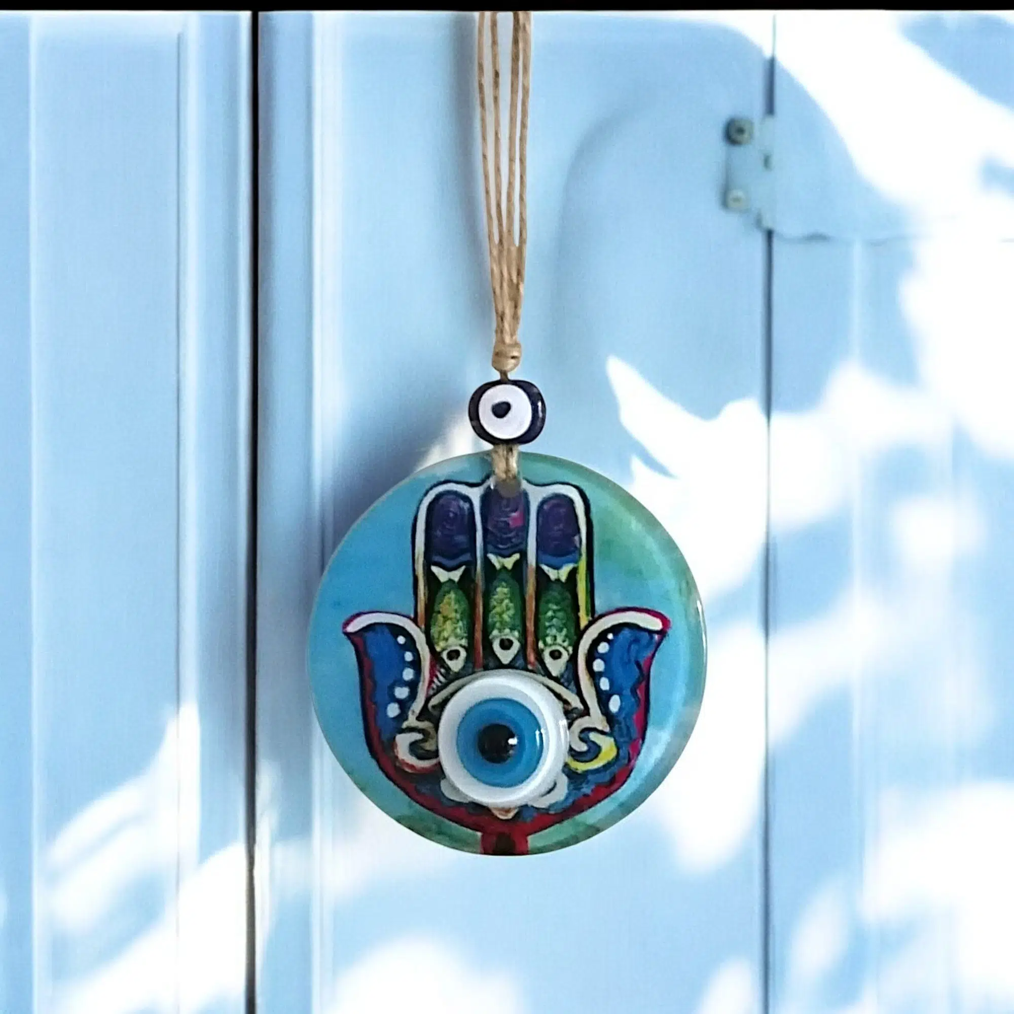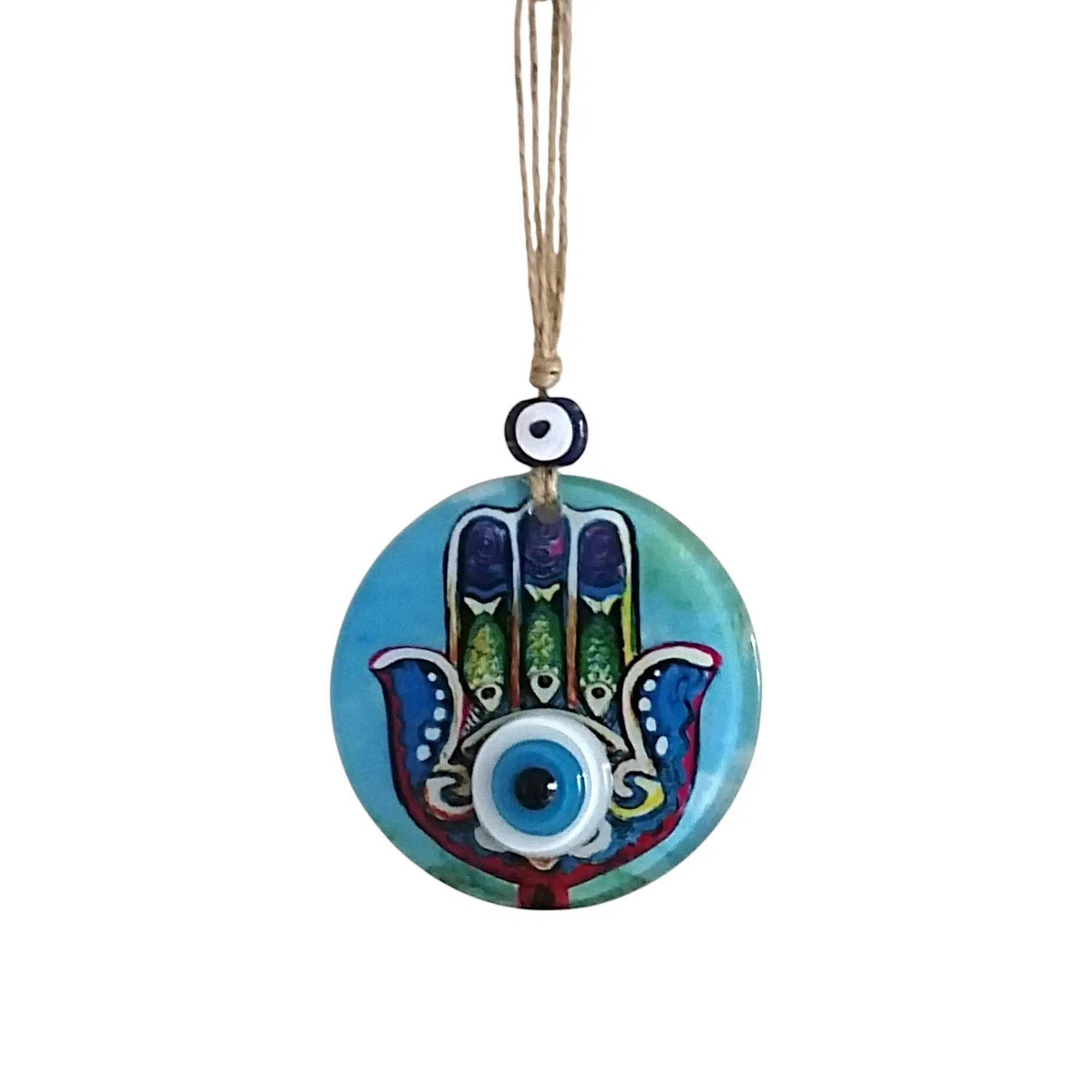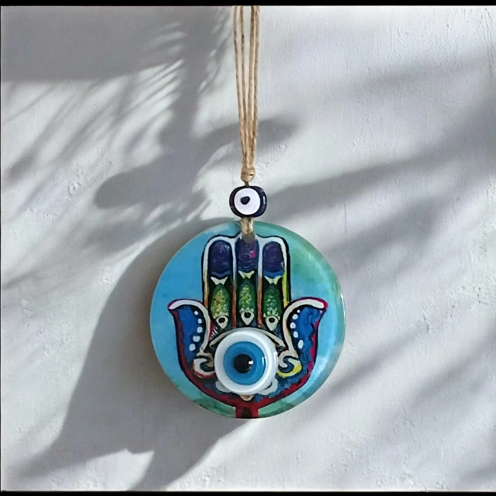 Mini boy Fatma Ana eli cam füzyon Mavi renk nazar boncuklu duvar süsümüz tamamen el işçiliği ile üretilmiştir. Tasarım harikası el yapımı nazar boncuklu duvar süsümüz 10 santimetre çapındadır. Ürünümüz ip dahil 23 santimetre boyundadır.