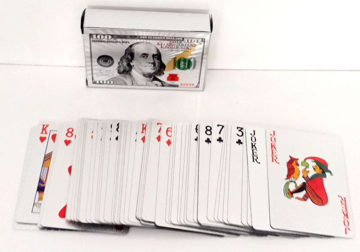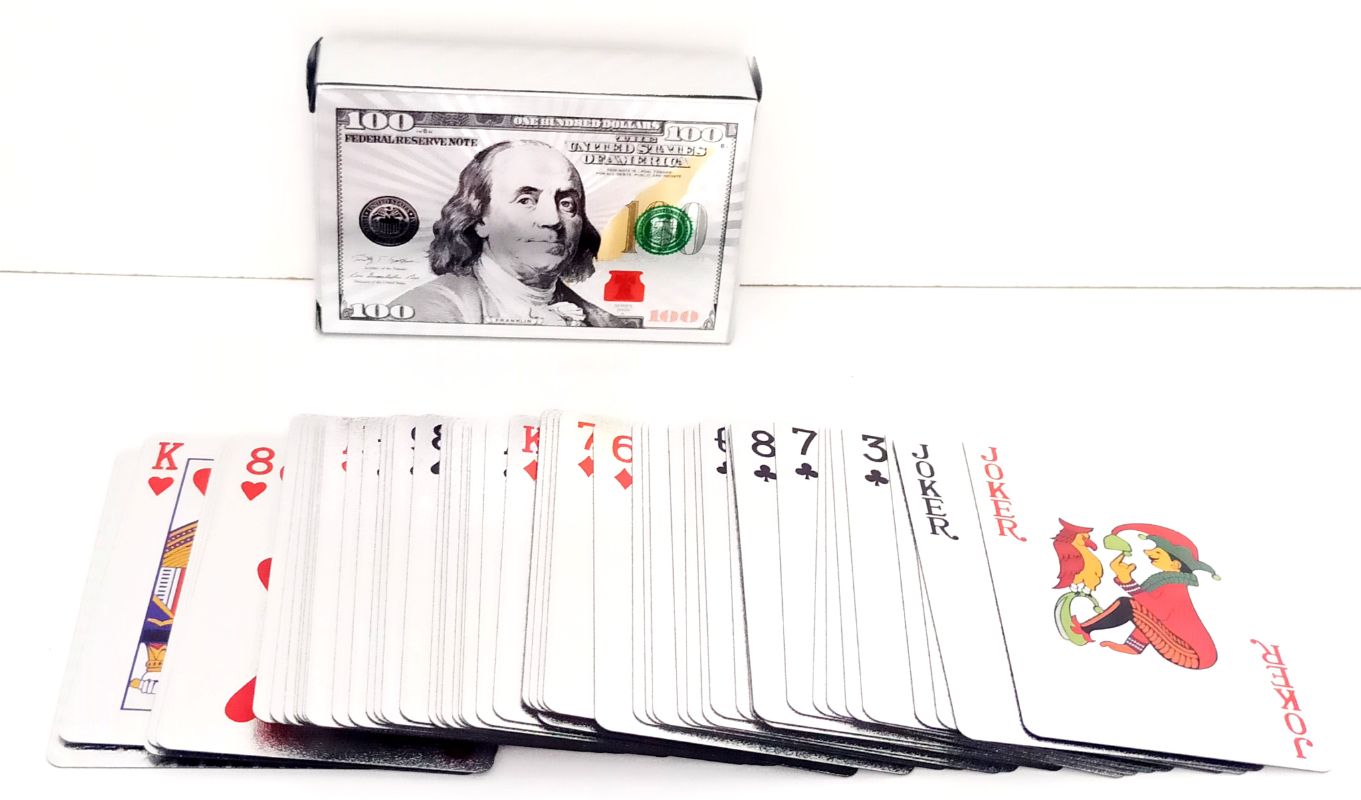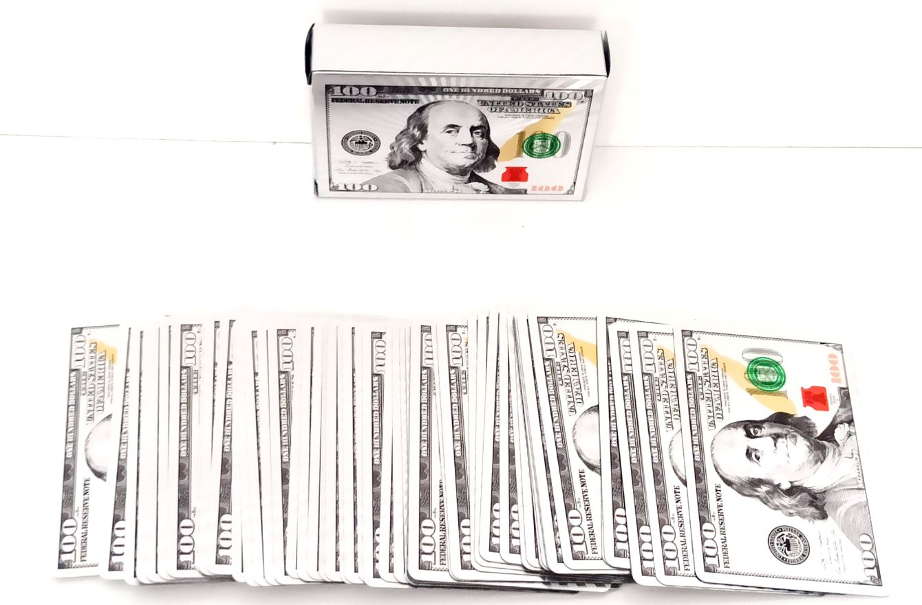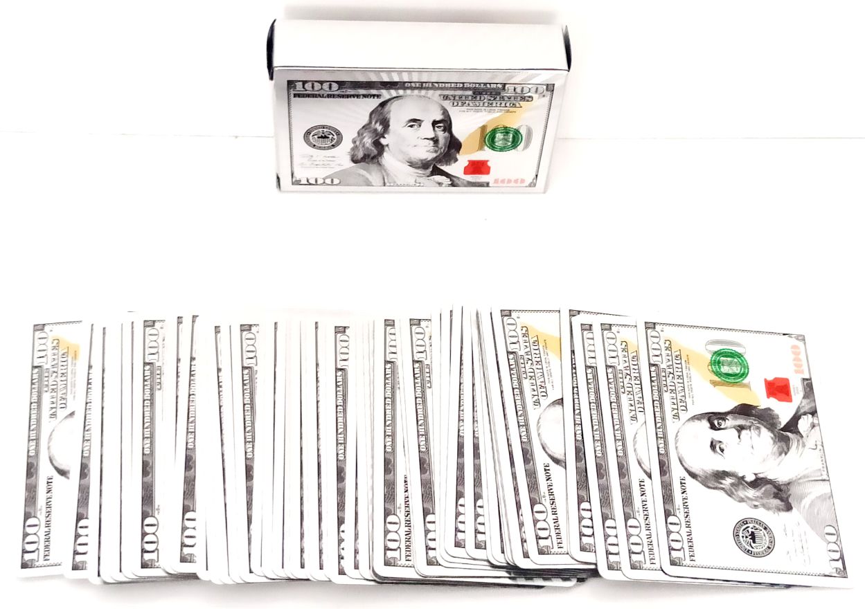 100 dolar şeklindeki İskambil kağıtlarımızla isterseniz pişti, isterseniz 51, isterseniz başka bir kağıt oyunu oynayabilirsiniz. Bu güzel ürünümüzü ister kendiniz için, isterseniz sevdiklerinize hediye etmek için tercih edebilirsiniz.