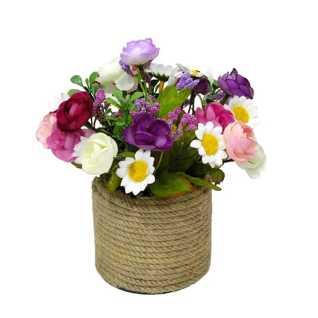 Hasır iplik kullanılarak ürünümüzün vazosu hazırlanmaktadır. Ürünümüzde yapay çiçek kullanılmaktadır. Vazomuz 10 cm eninde, 10 cm boyundadır. Çiçekler dahil vazomuz 20 santimetredir.