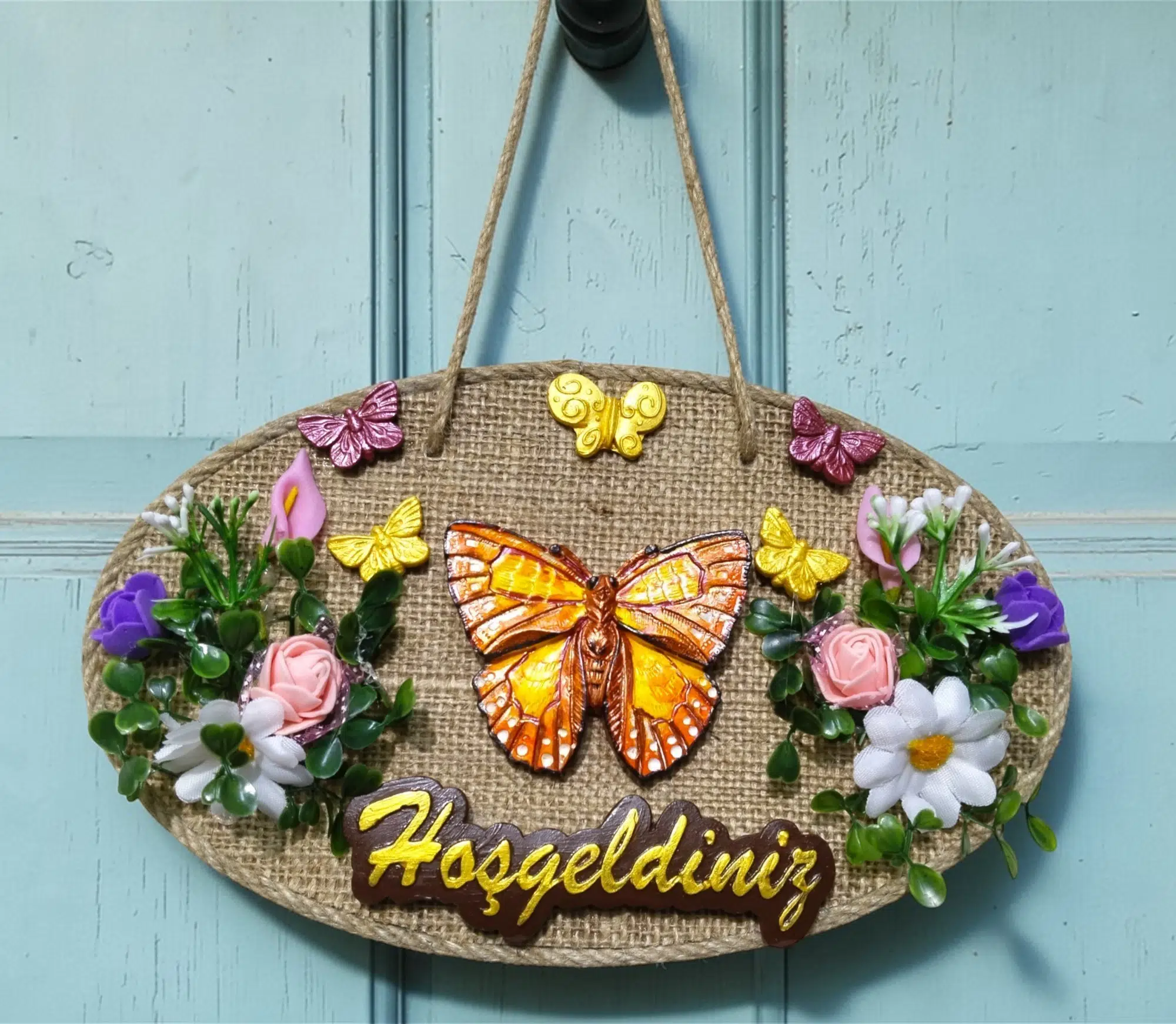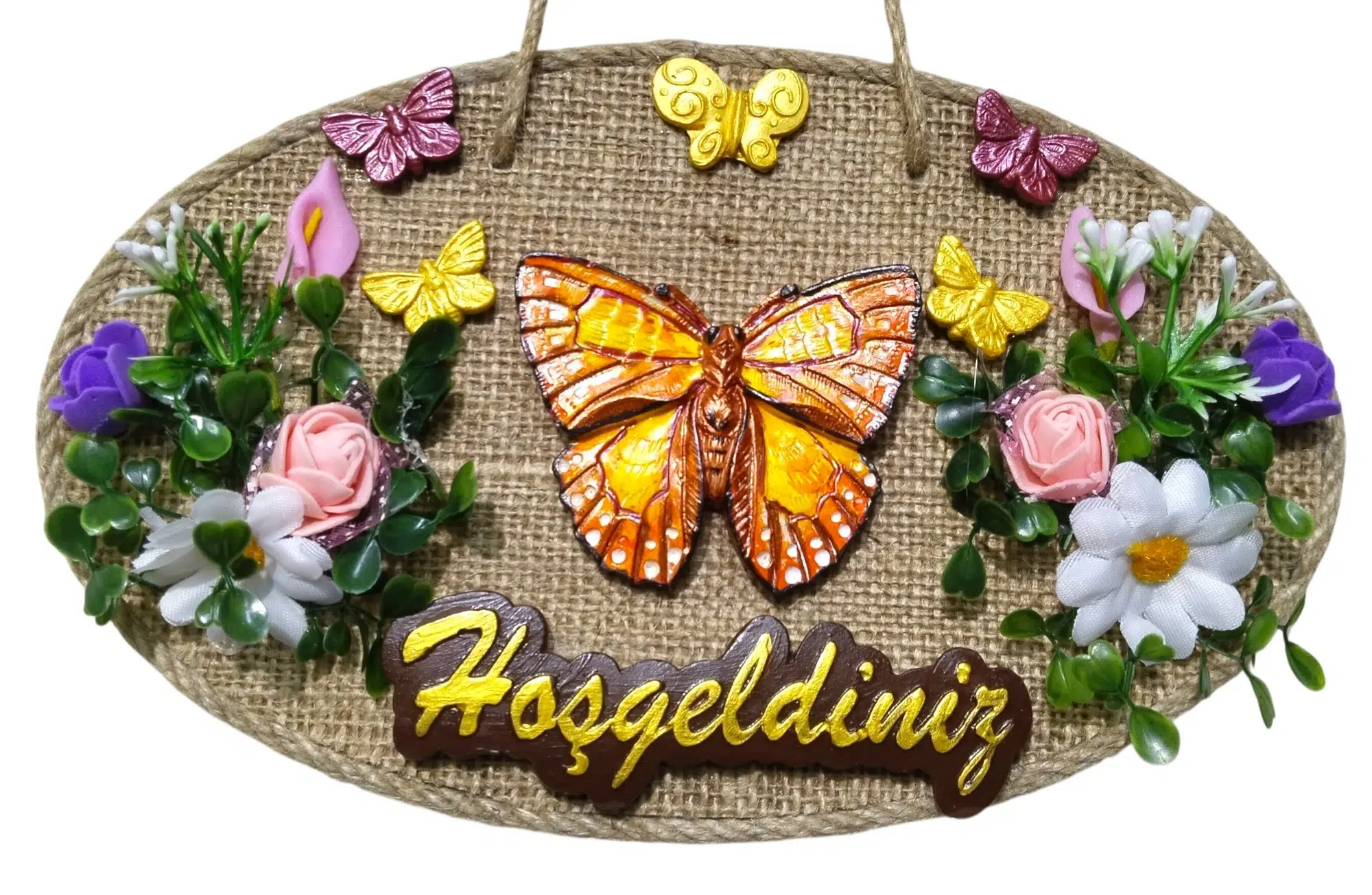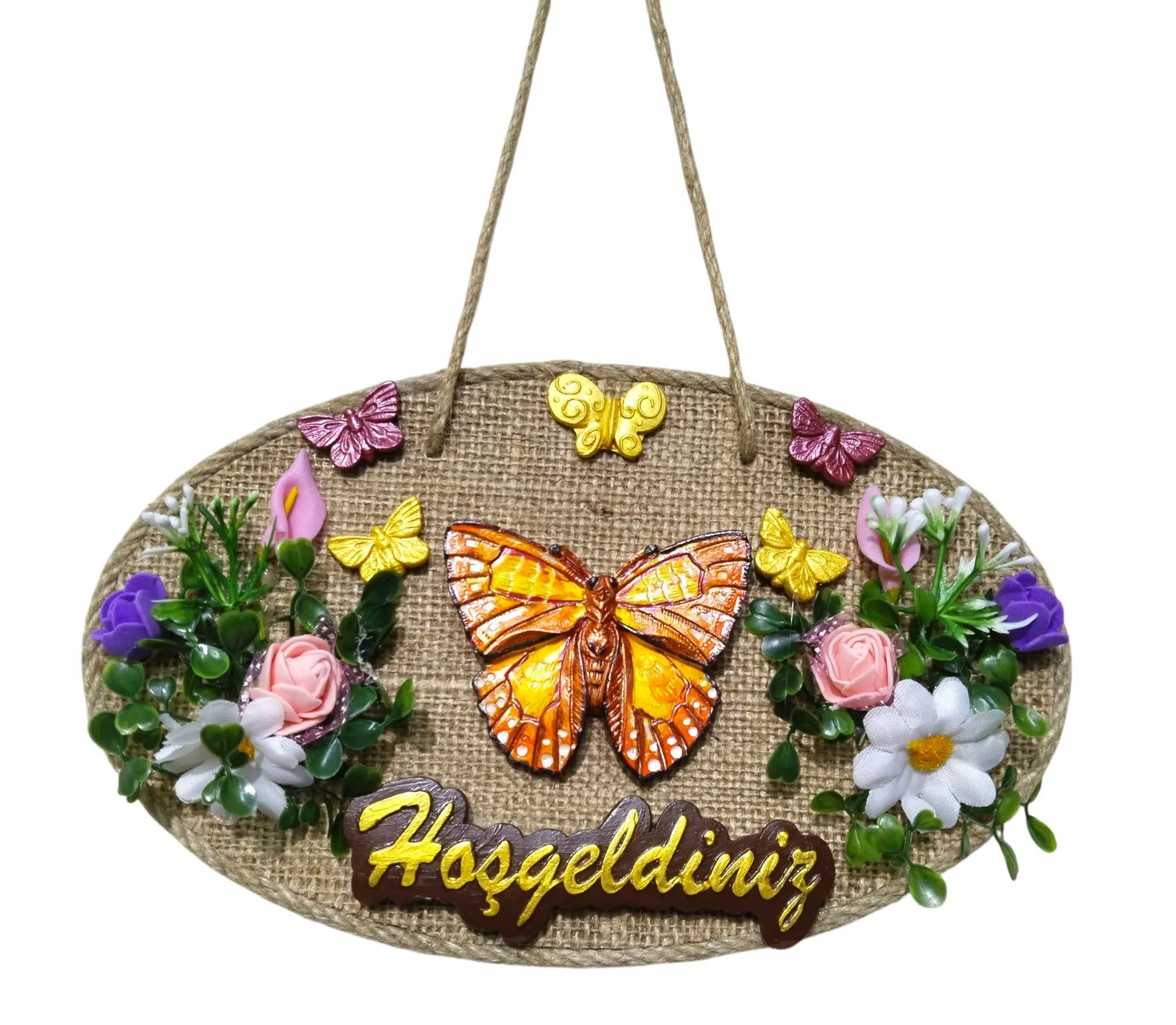 | Etiketler | Jüt Hasır Zeminli "Hoşgeldiniz" Kapı Süsü - Kelebek ve Çiçek Motifli Dekoratif Askı (16x26 cm) |