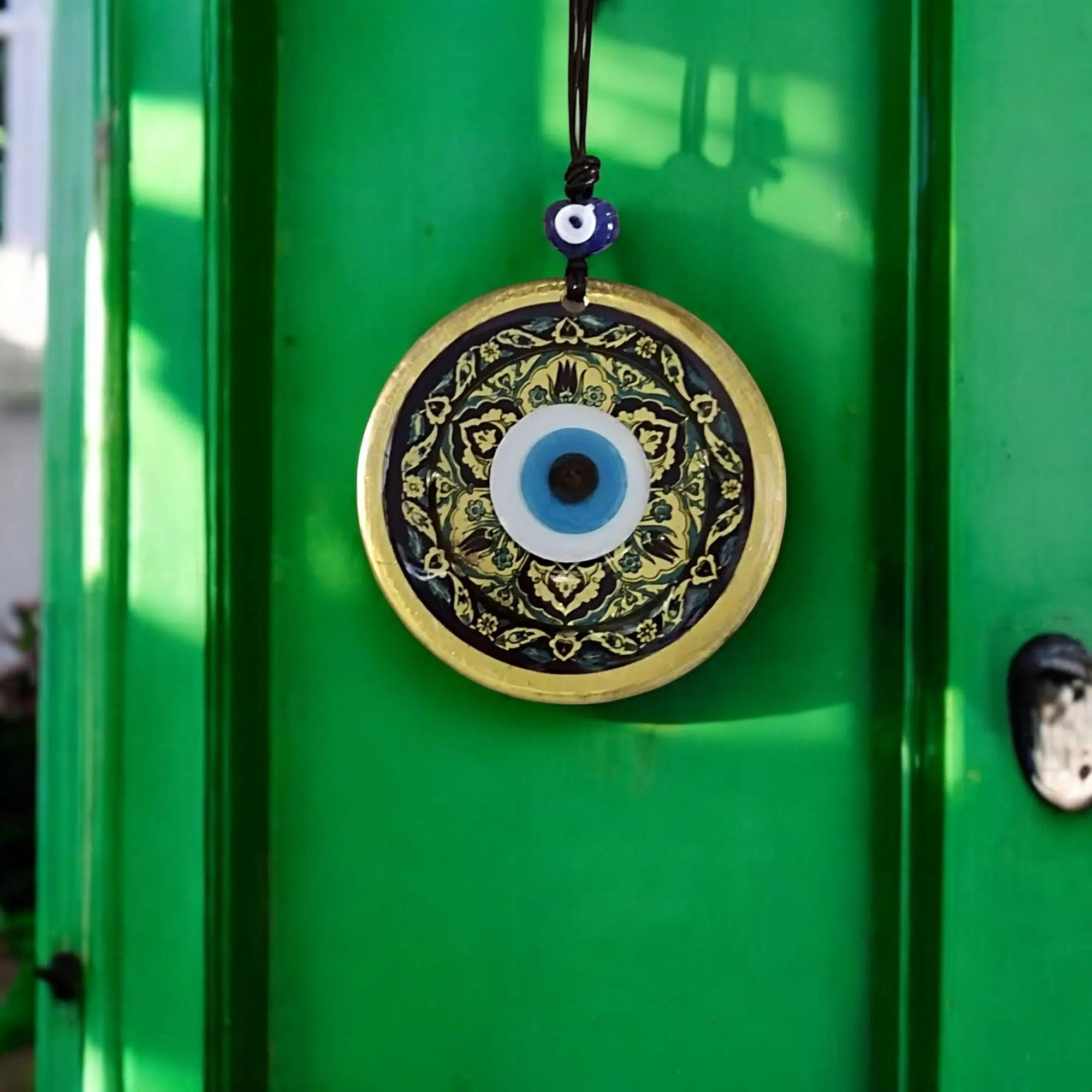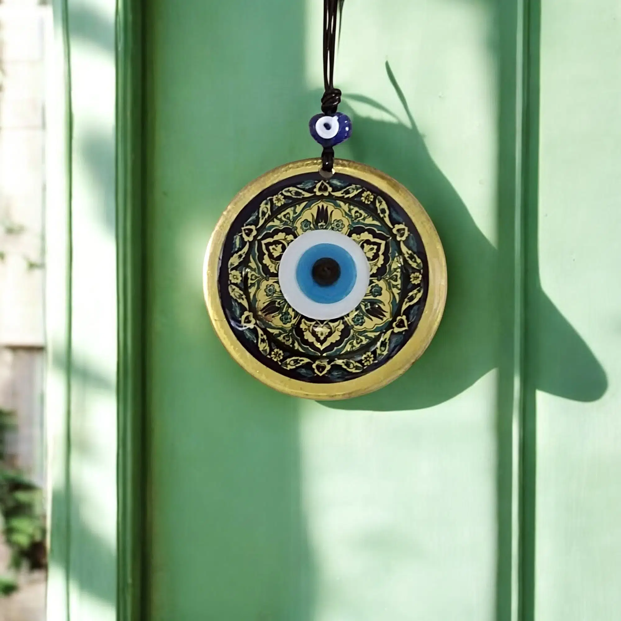 Altın varaklı ve Lale desenli duvar süsümüz tamamen el işçiliği ile üretilmiştir. Nazar boncuklu duvar dekorumuz 12 santimetre Çapındadır. Ürünümüz ip dahil 25 santimetre boyundadır.