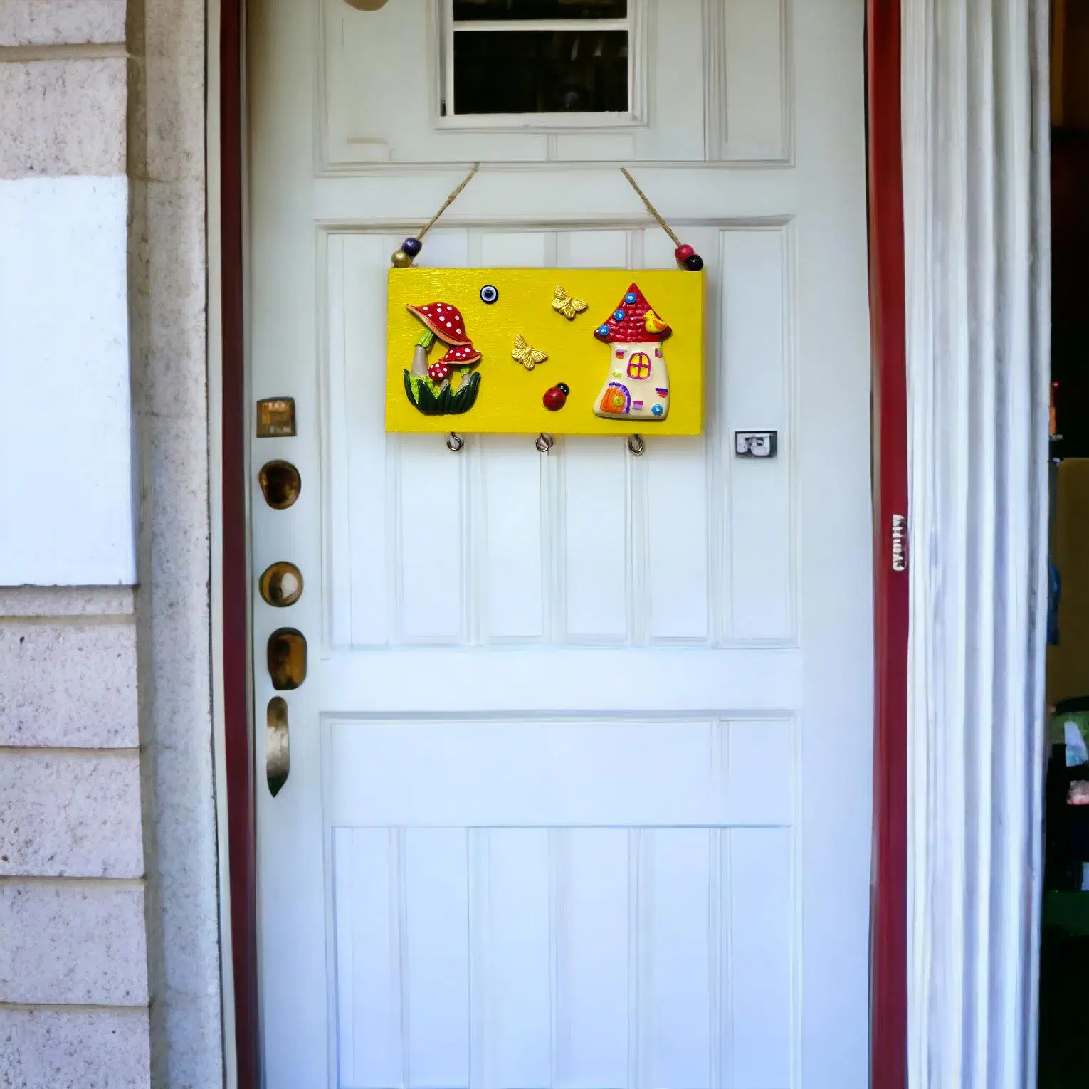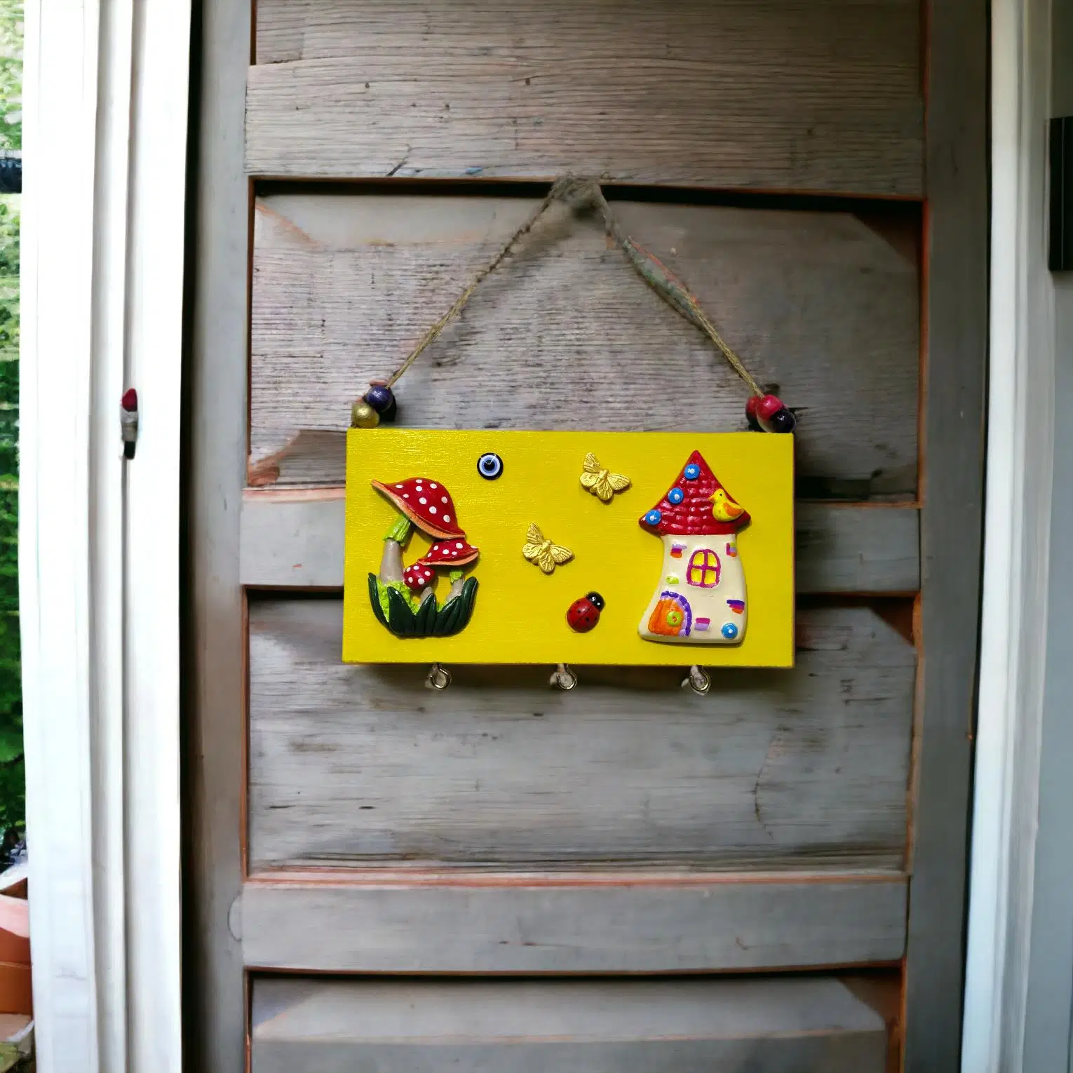 | Etiketler | Mantarlı Ev Modelli Kelebekli Anahtarlık Pano El Boyaması Sarı Kapı Süsü |