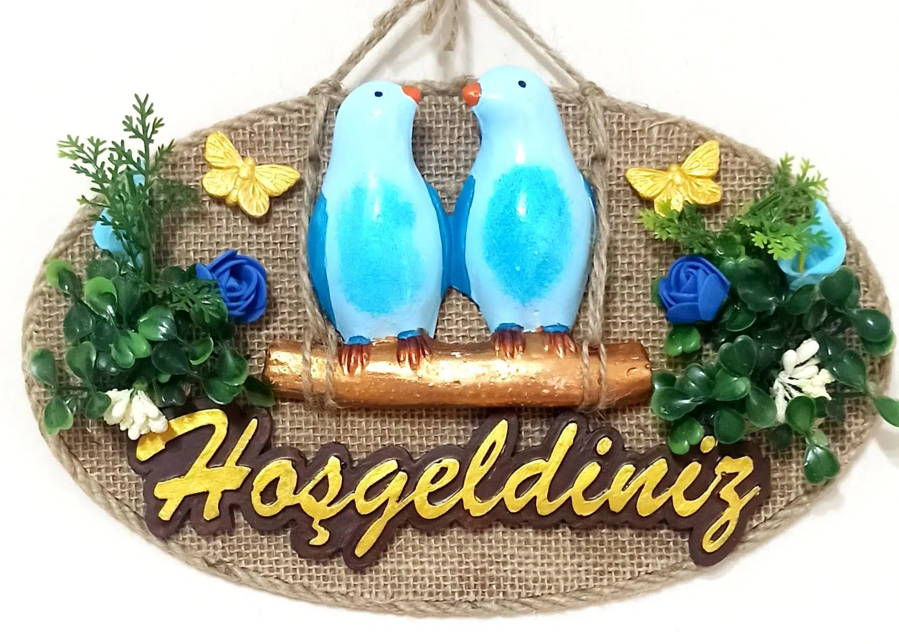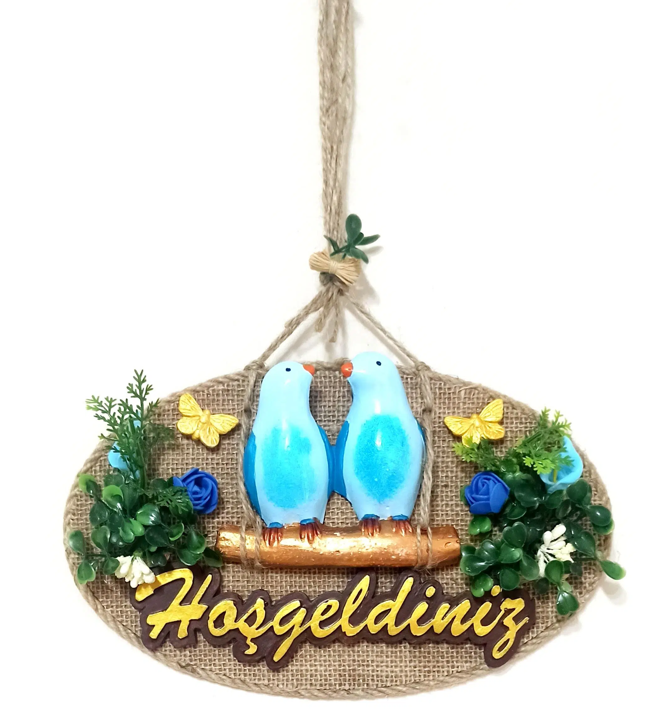 Mavi kuşlu kapı süsümüz ipsiz 26 santimetre eninde, 16 santimetre boyundadır. Ürünümüz ip dahil 29 santimetre boyundadır. Ürünümüzün 4 mm mdf üzerine jüt kumaş sarılarak zemini hazırlanmaktadır. Daha sonra objeler elde boyanarak ürünümüz hazırlanmaktadır.