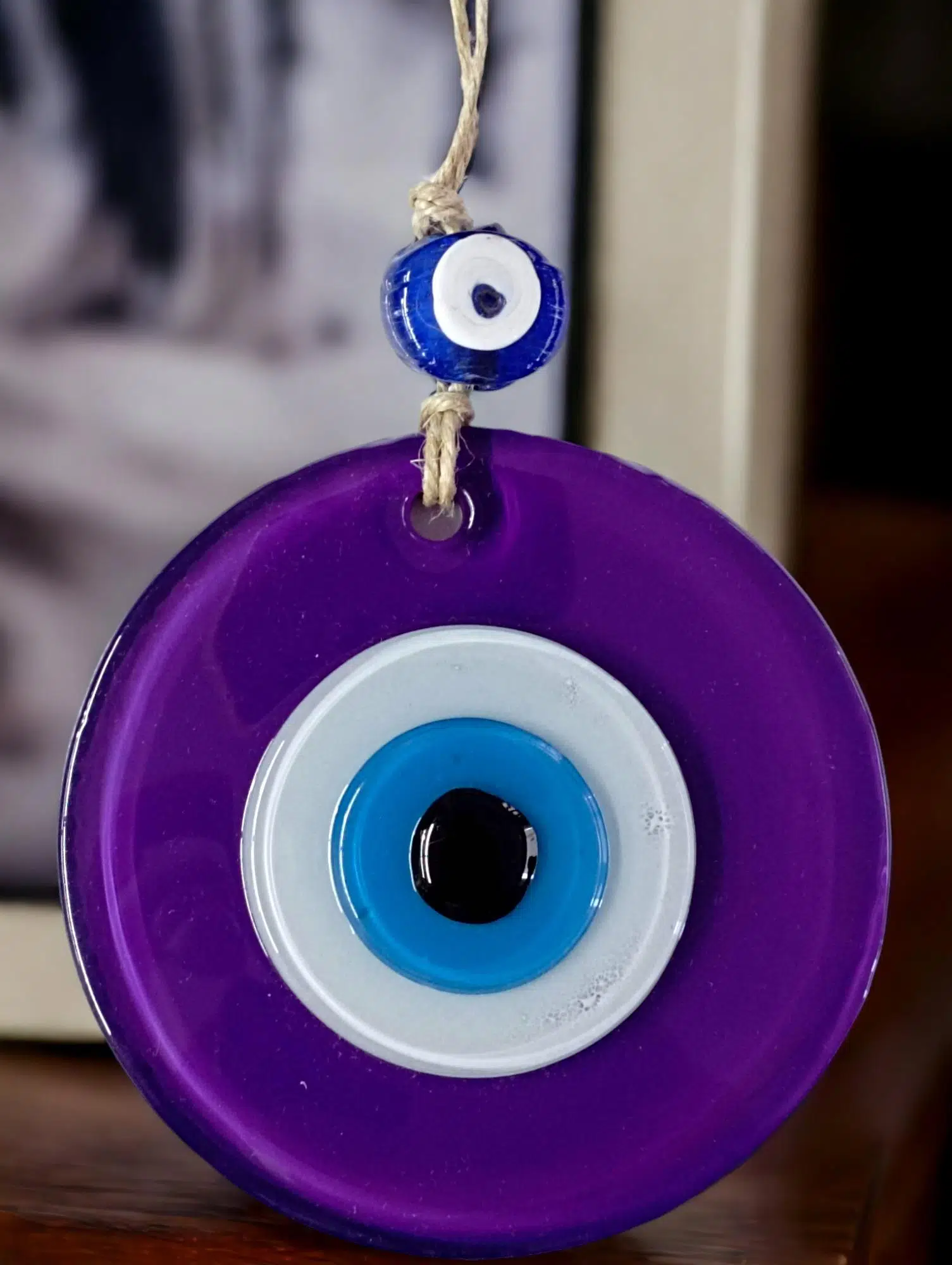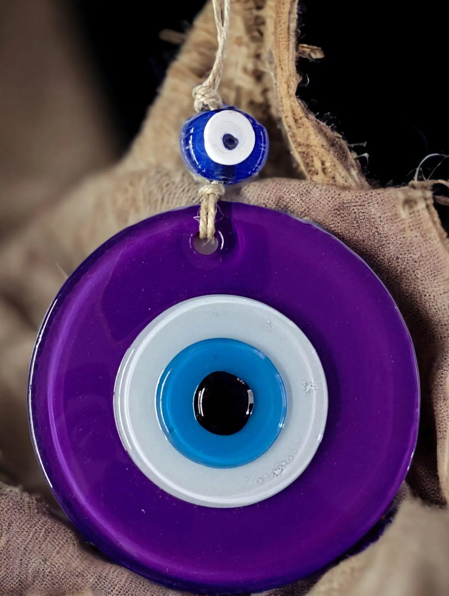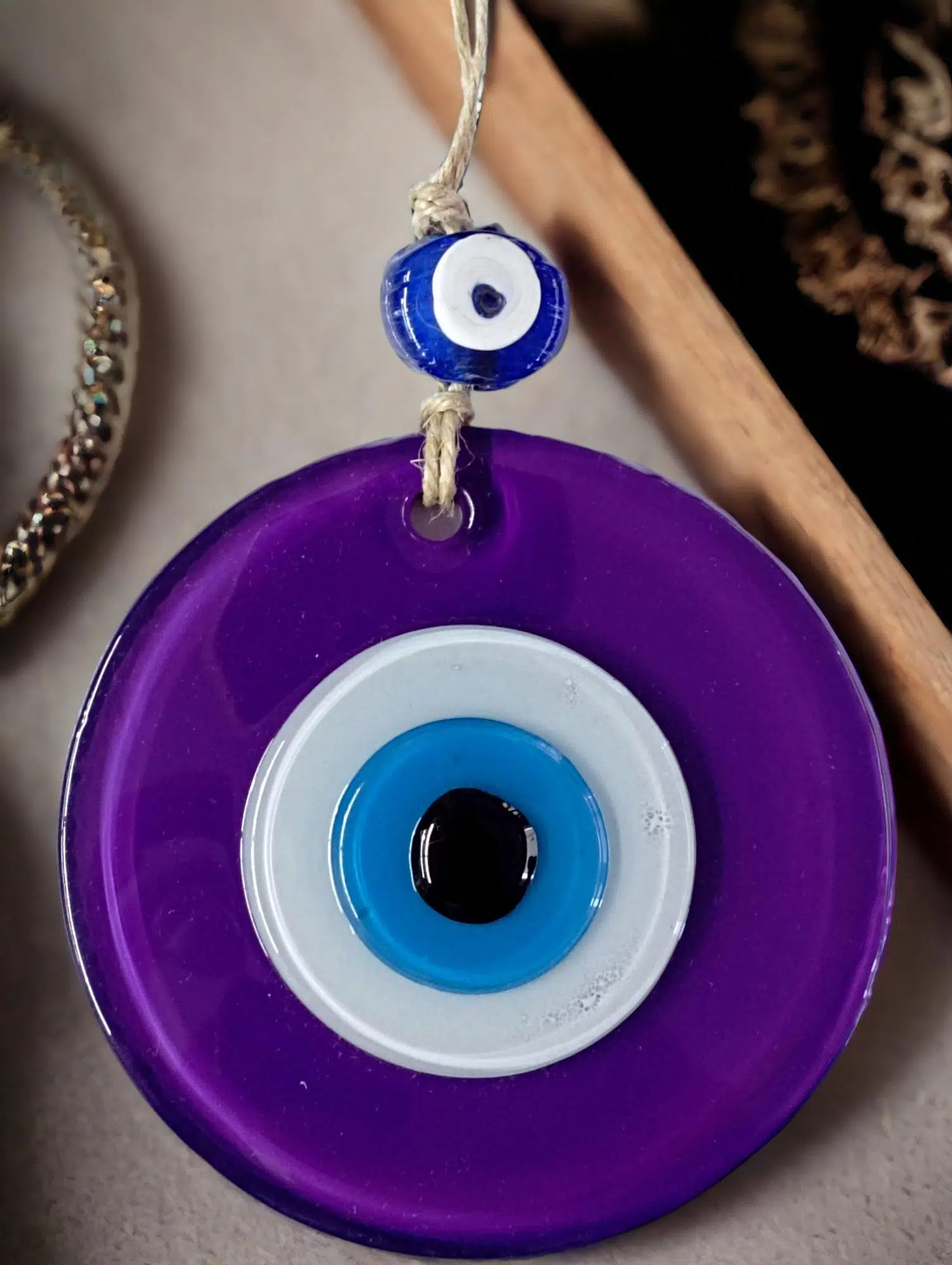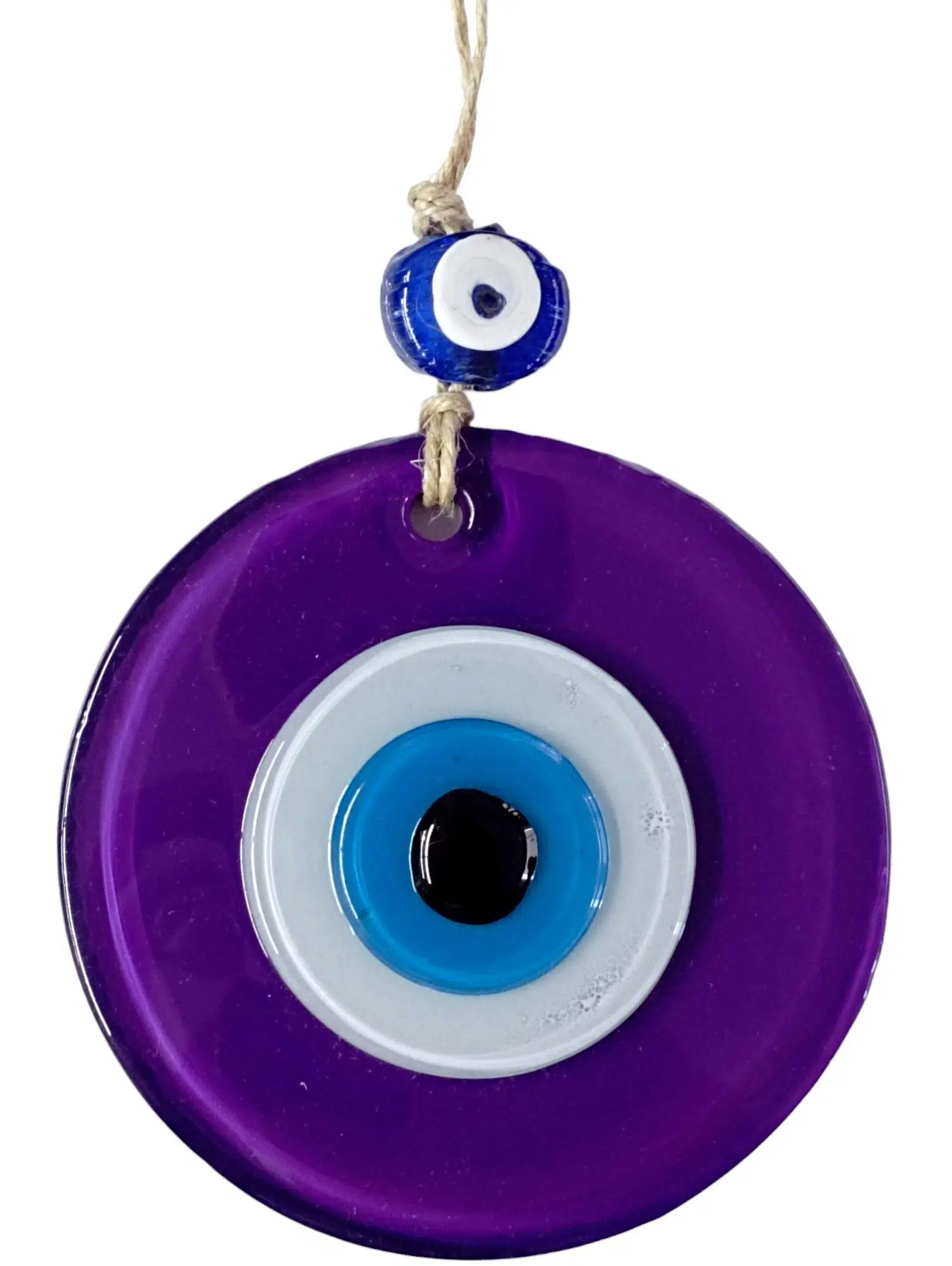 Mini boy mor renk nazar boncuklu duvar süsümüz tamamen el işçiliği ile üretilmiştir. Tasarım harikası el yapımı nazar boncuklu duvar süsümüz 10 x 10 santimetre ölçülerindedir. Ürünümüz ip dahil 23 santimetre boyundadır.