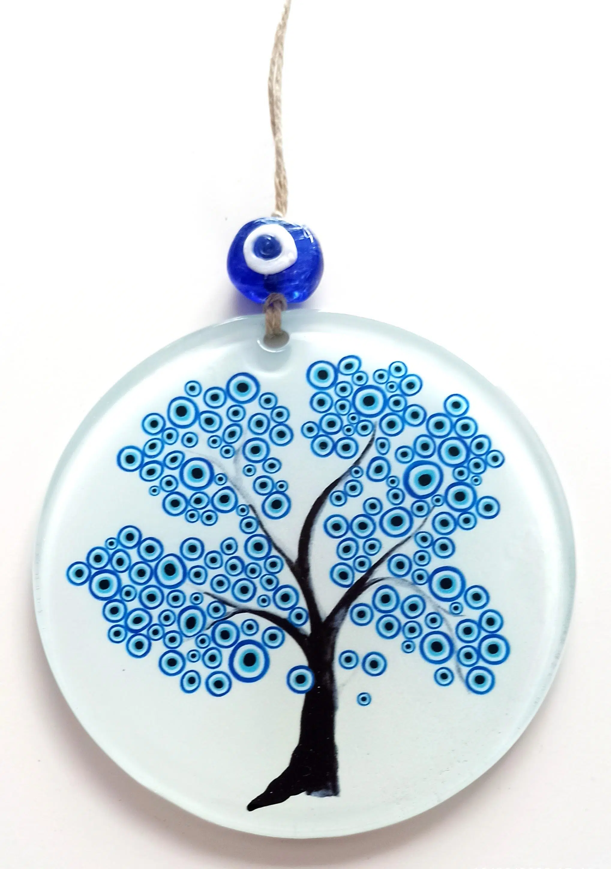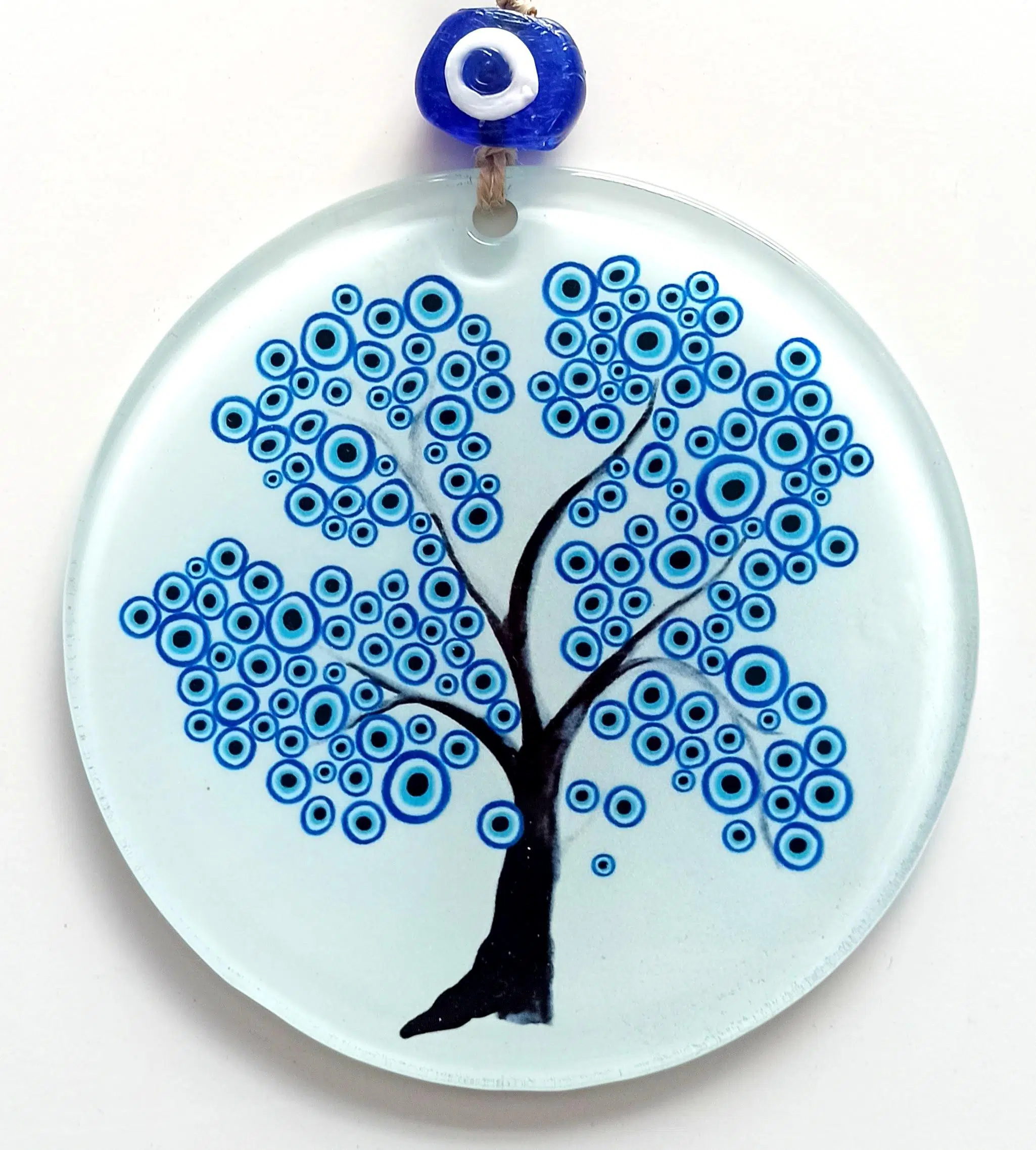 Nazar ağacı duvar süsümüzün yuvarlak kısmı 12 santimetre çapındadır. Ürünümüz ip dahil yaklaşık 25 santimetre boyundadır. Özel tasarım füzyon cam duvar süsümüzü ister kendiniz için, isterseniz sevdiklerinize hediye etmek için tercih edebilirsiniz.