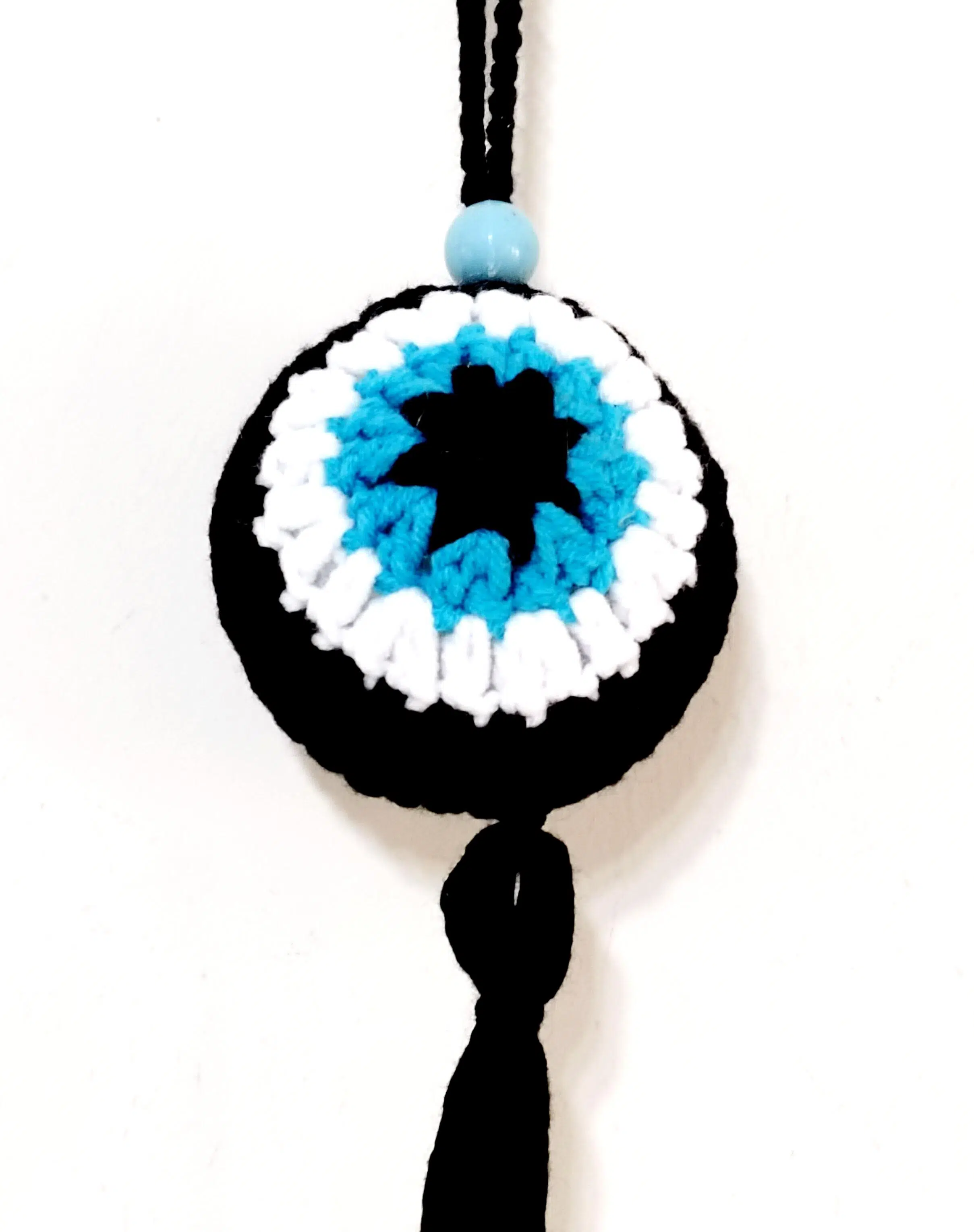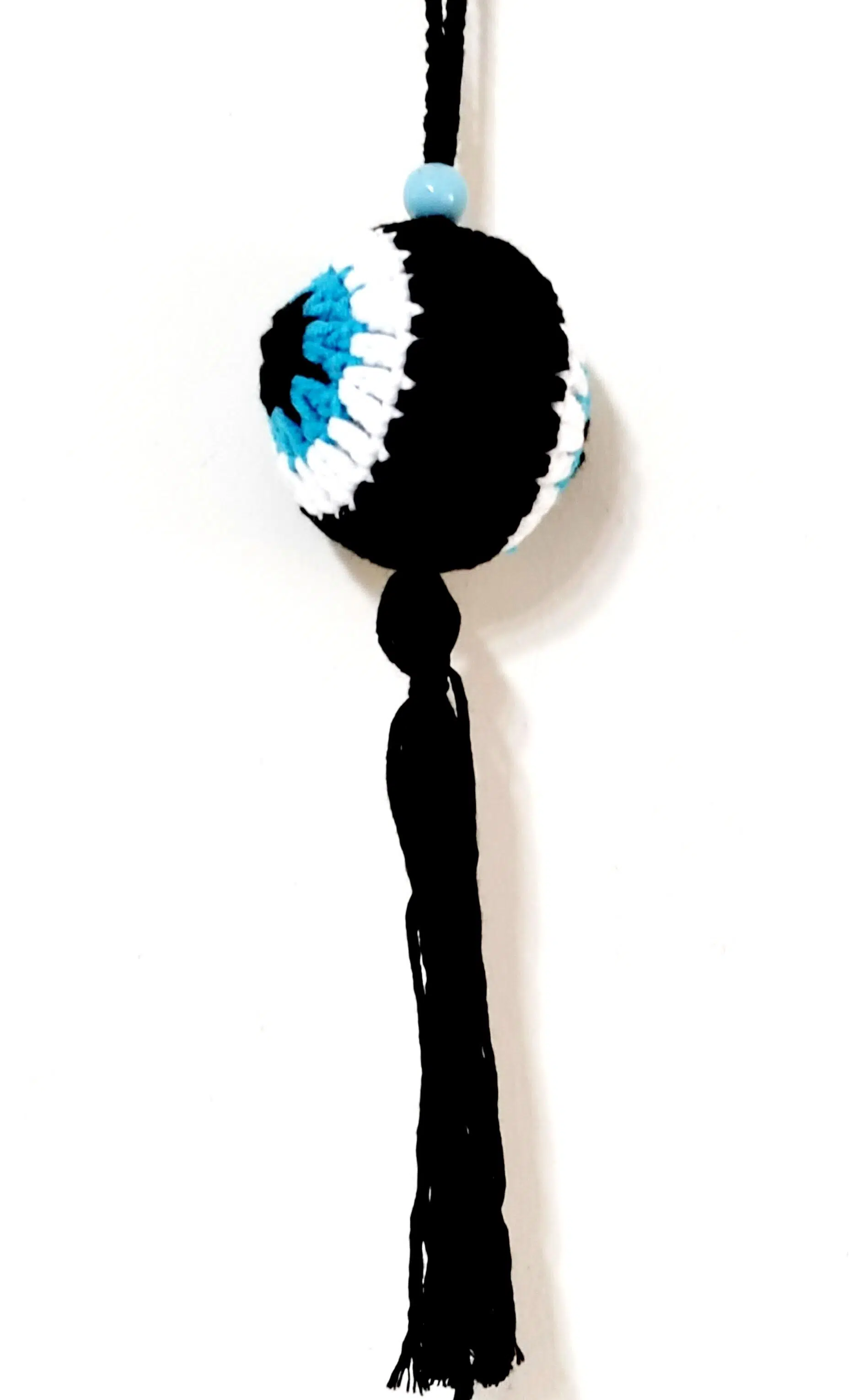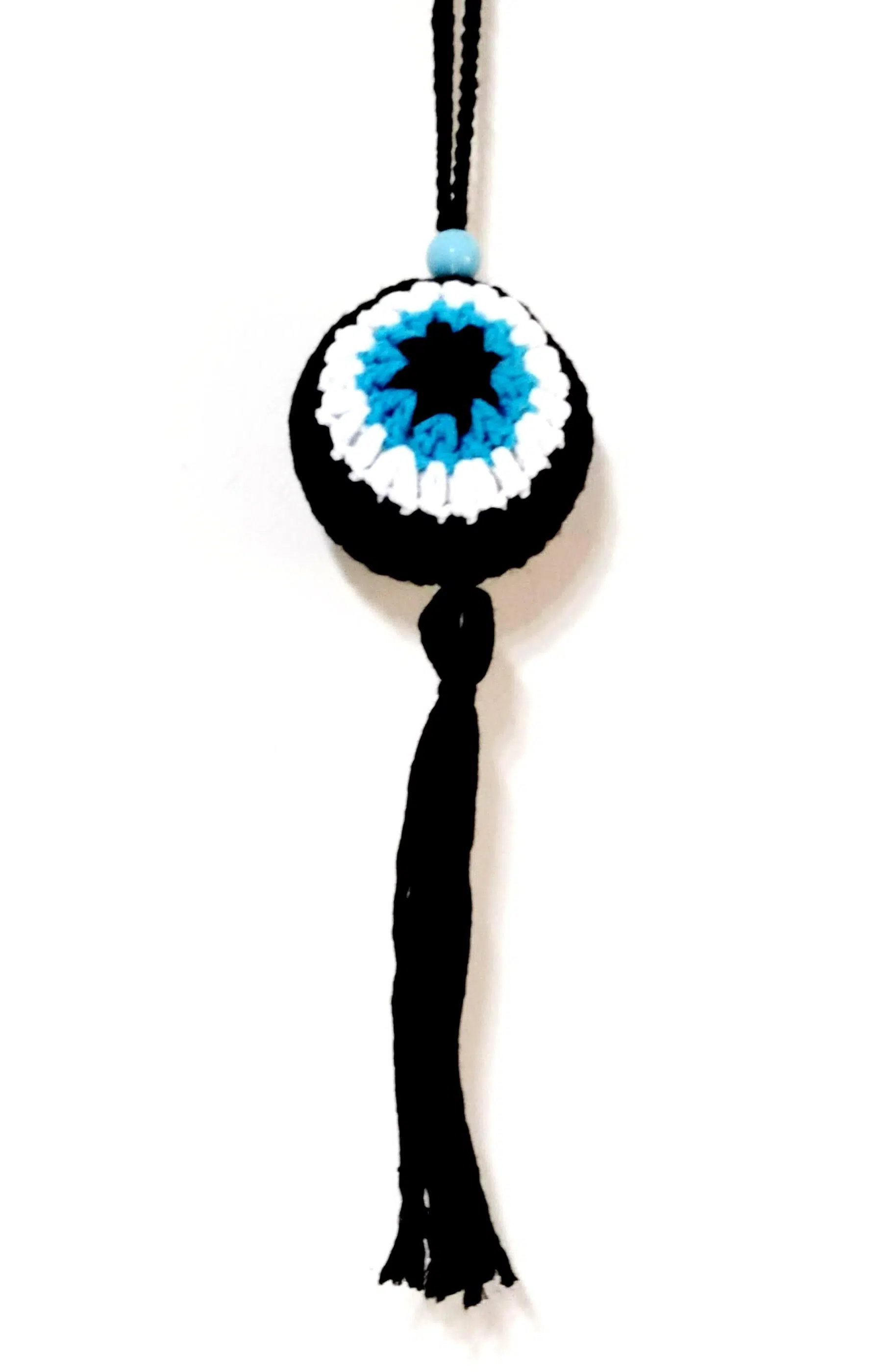 Nazar boncuğu desenli el örgüsü ürünümüz siyah orlon ip ile üretilmektedir. Püsküllü araba süsümüzün yuvarlak kısmı 7 santimetre çapındadır. Ürünümüz 23 santimetre boyundadır.
