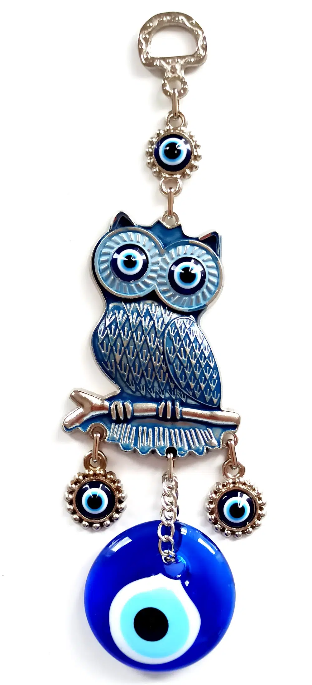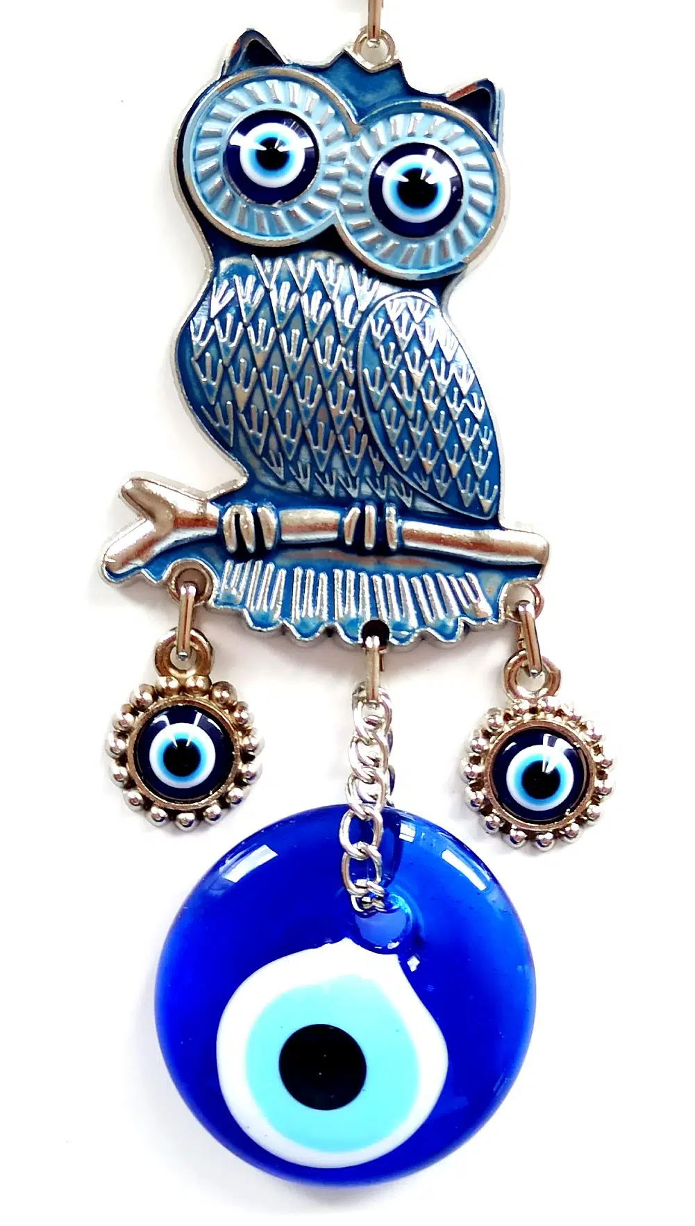 Lacivert renk baykuş duvar süsümüz özel tasarım olarak gümüş renkli olarak mine işlemesi ile üretilmiştir. Lacivert renk nazar boncuklu duvar süsümüz 4 x 15 santimetre ölçülerindedir.
