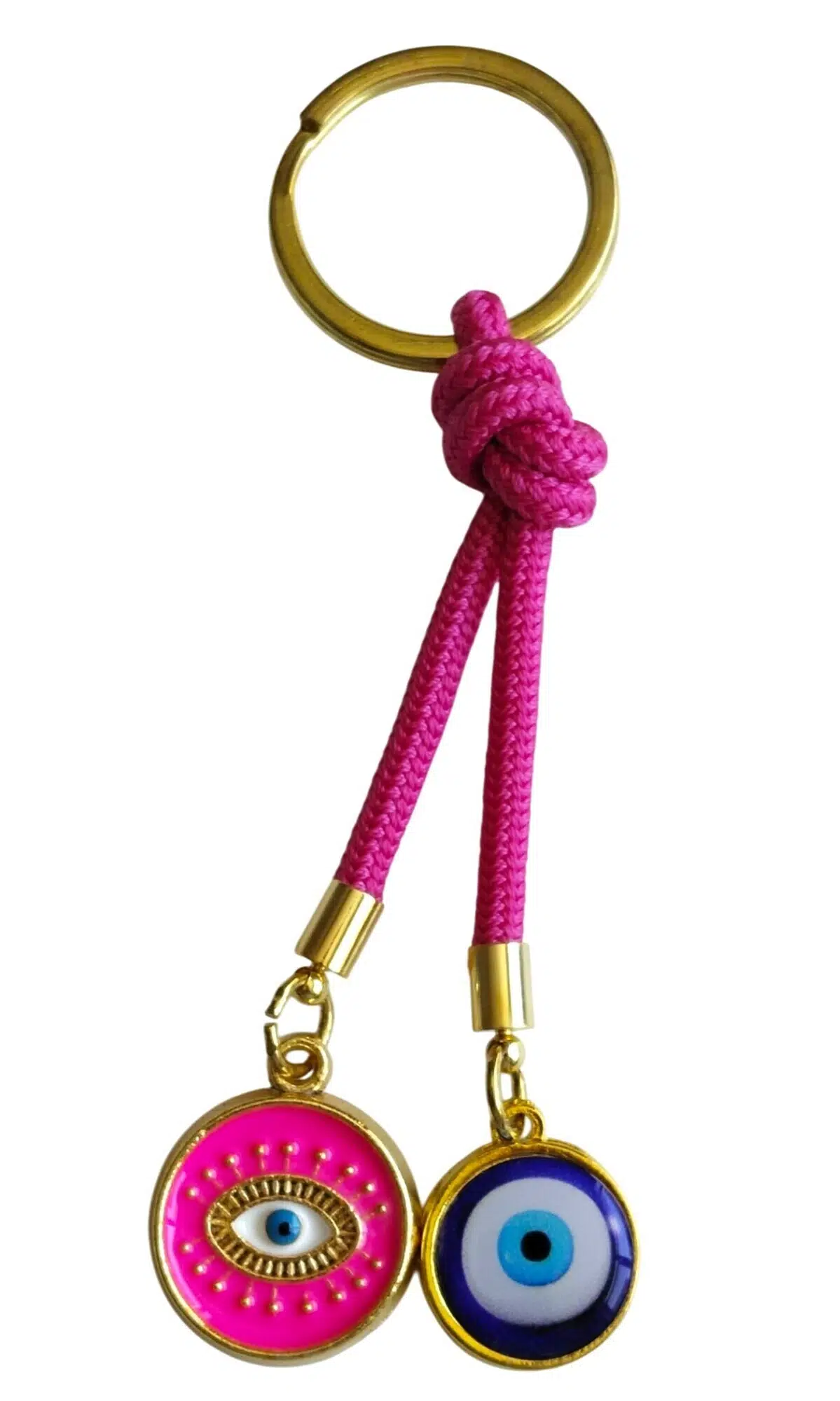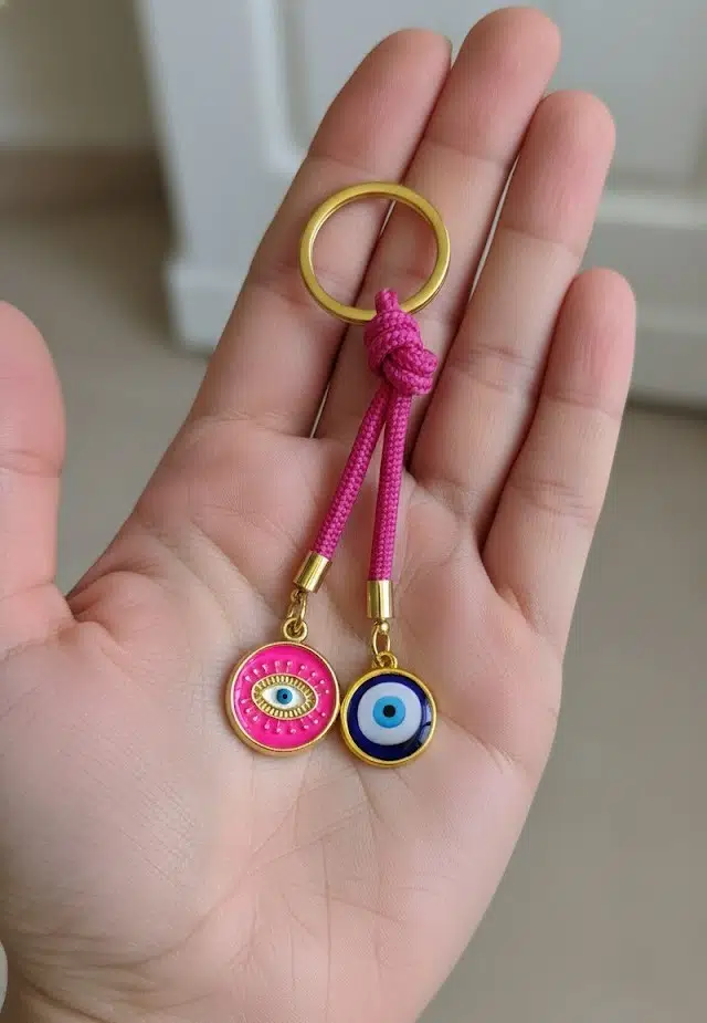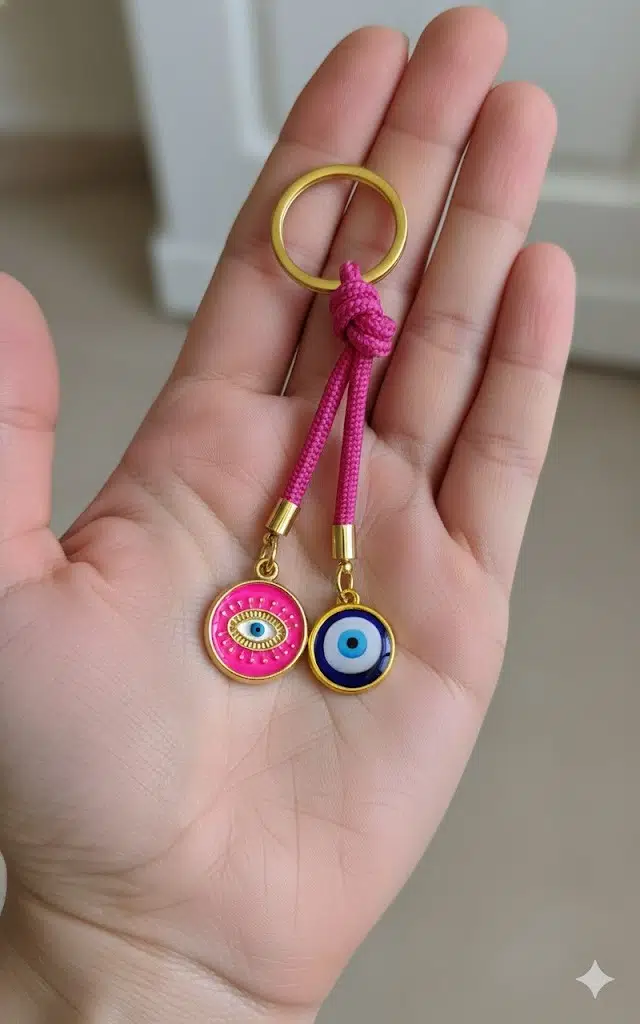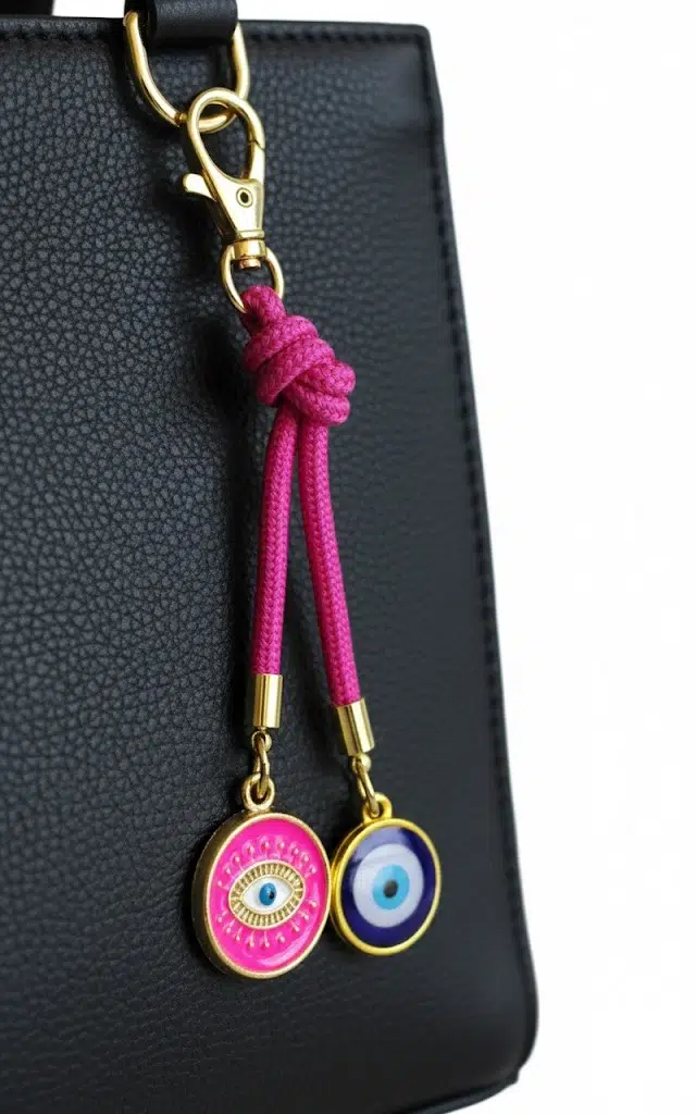 Çantalarınıza hem renk hem de anlam katacak bu özel tasarım Nazar Boncuklu Çanta Süsü, modern dokunuşlarla geleneksel figürleri bir araya getiriyor. Canlı fuşya tonundaki dayanıklı halat kordonu ve yüksek kaliteli altın rengi metal detaylarıyla stilinizi bir adım öne çıkarın.