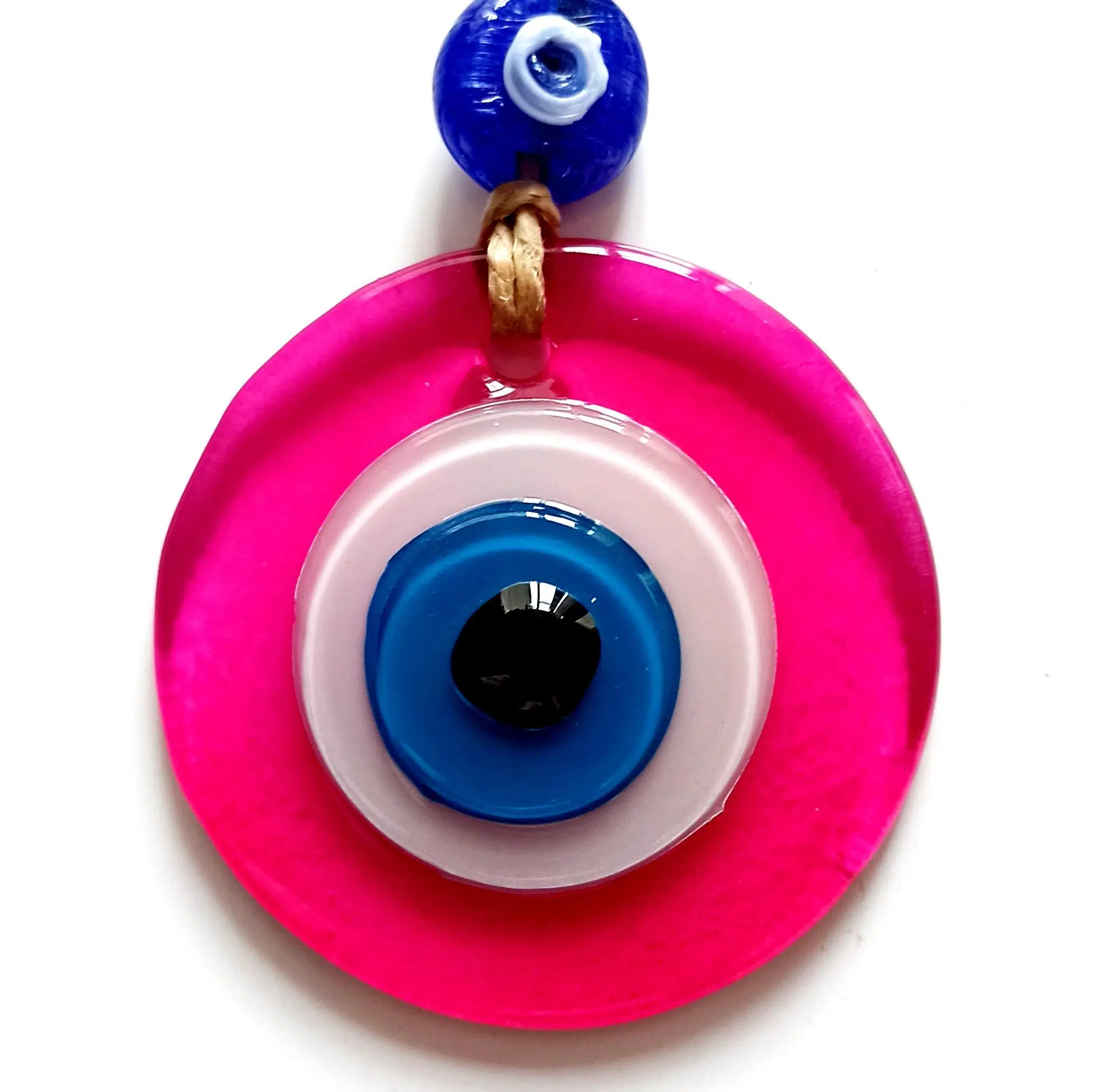 Nazar boncuklu ürünümüz fuşya rengindedir. Mini cam duvar süsümüz 7 santimetre çapındadır. Ürünümüz ip dahil 23 santimetre boyundadır.