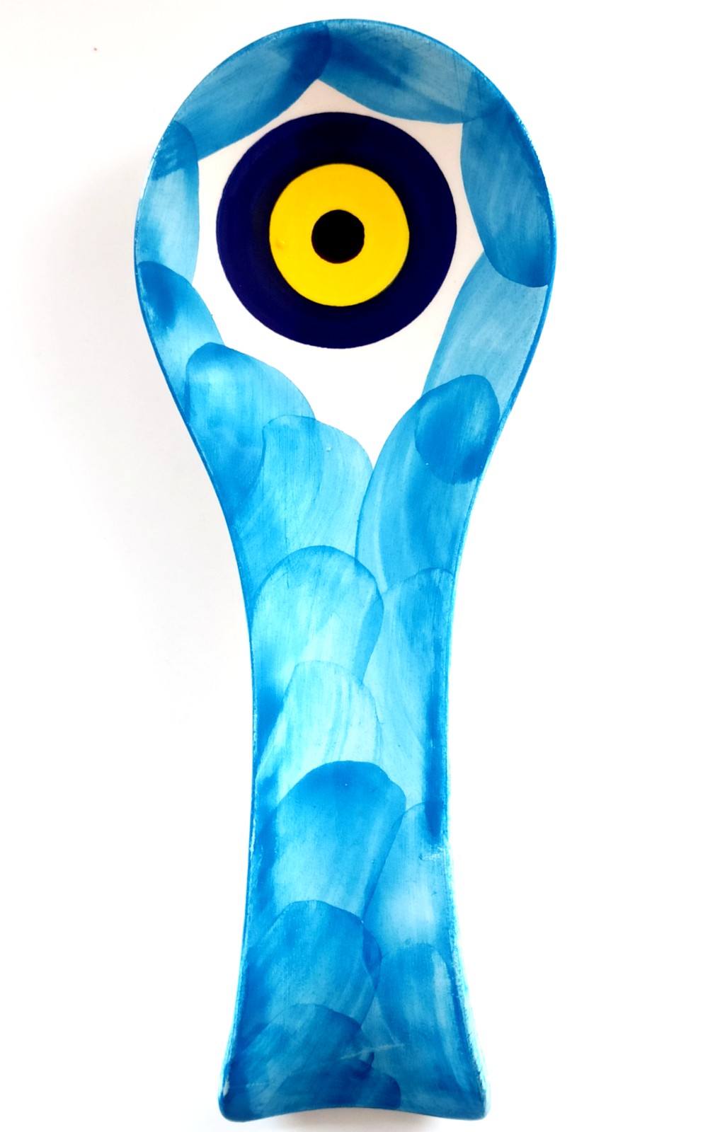 Nazar boncuklu tezgah üstü seramik kaşıklık tamamen el işçiliği ile üretilmiştir. Ürünümüz 9 santimetre eninde, 24 santimetre boyundadır.