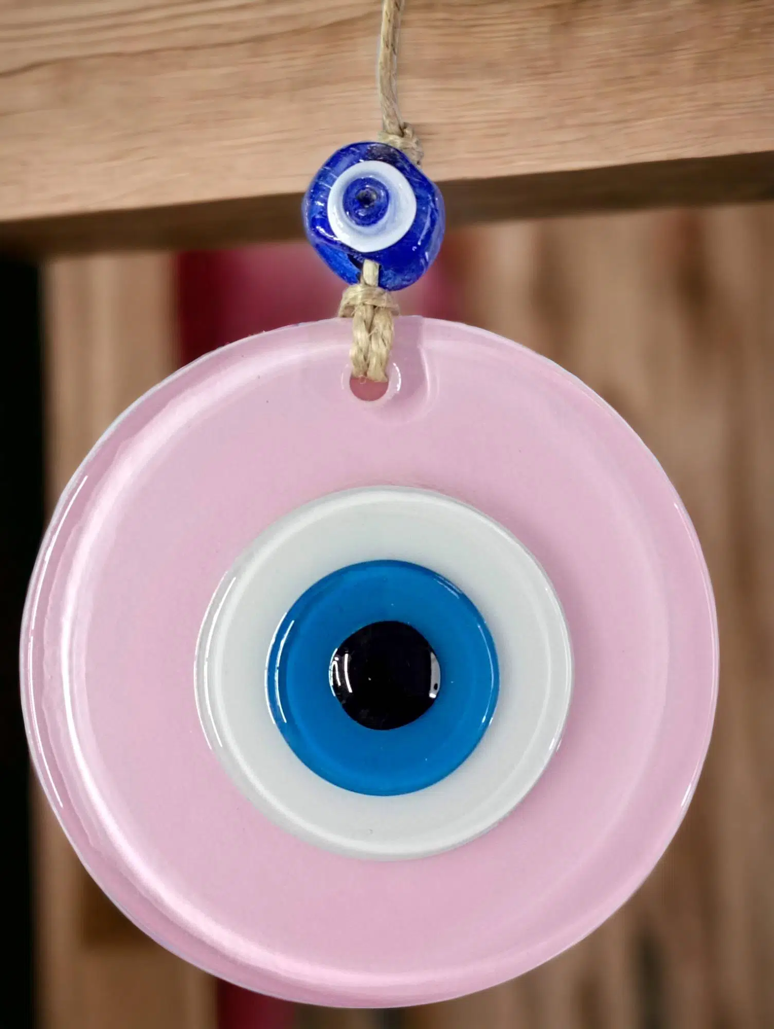 Mini boy pudra pembe renk nazar boncuklu duvar süsümüz tamamen el işçiliği ile üretilmiştir. Tasarım harikası el yapımı nazar boncuklu duvar süsümüz 10 x 10 santimetre ölçülerindedir. Ürünümüz ip dahil 23 santimetre boyundadır.