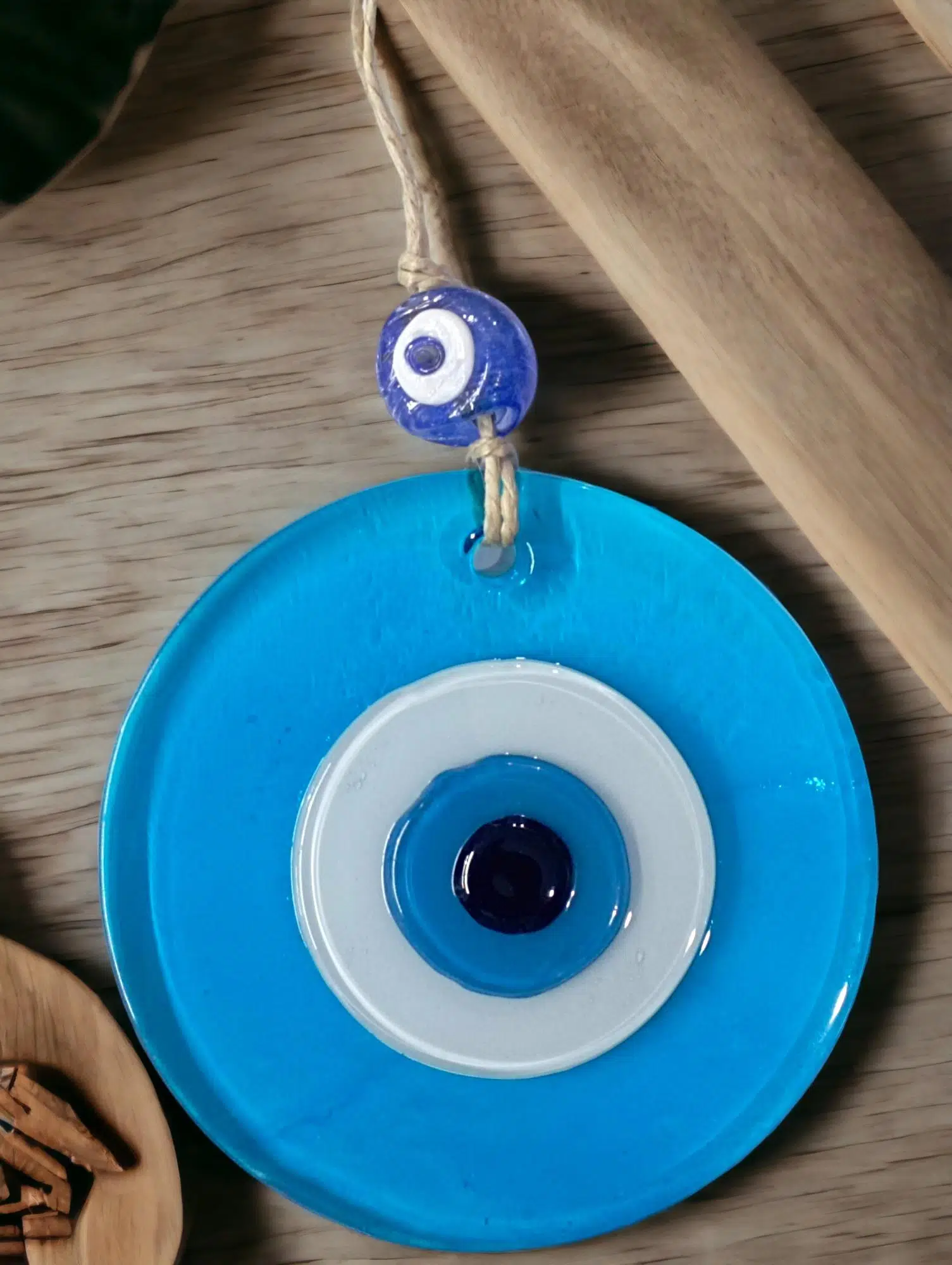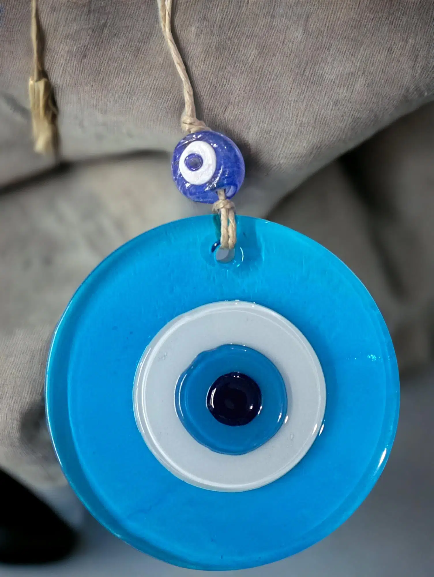 Mini boy şeffaf mavi renk nazar boncuklu duvar süsümüz tamamen el işçiliği ile üretilmiştir. Tasarım harikası el yapımı nazar boncuklu duvar süsümüz 10 x 10 santimetre ölçülerindedir. Ürünümüz ip dahil 23 santimetre boyundadır.