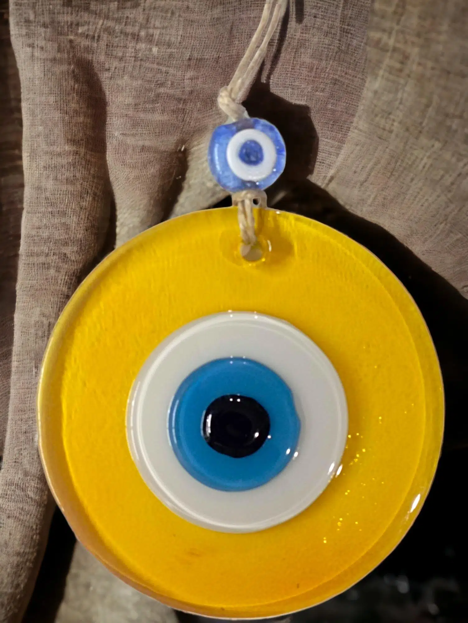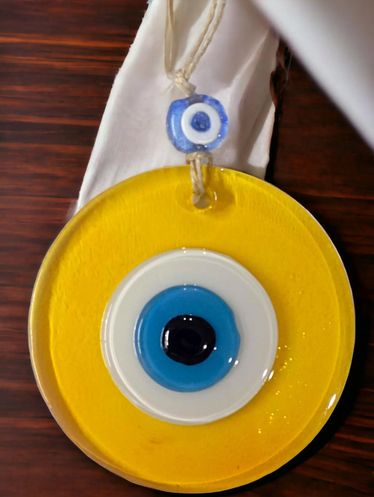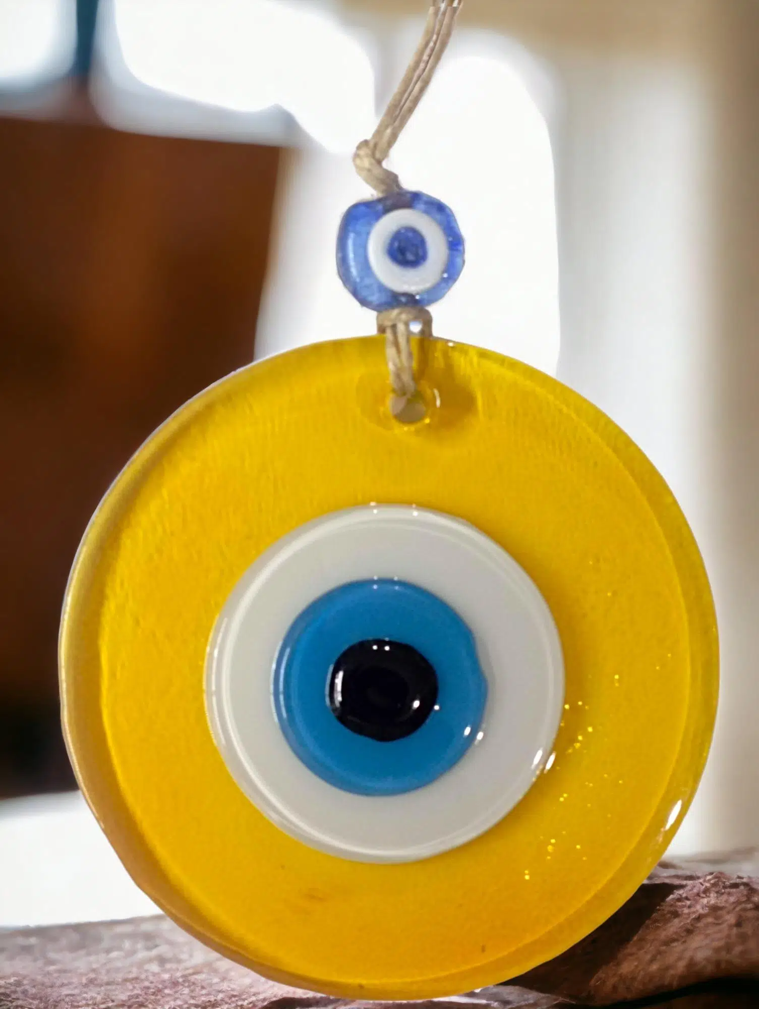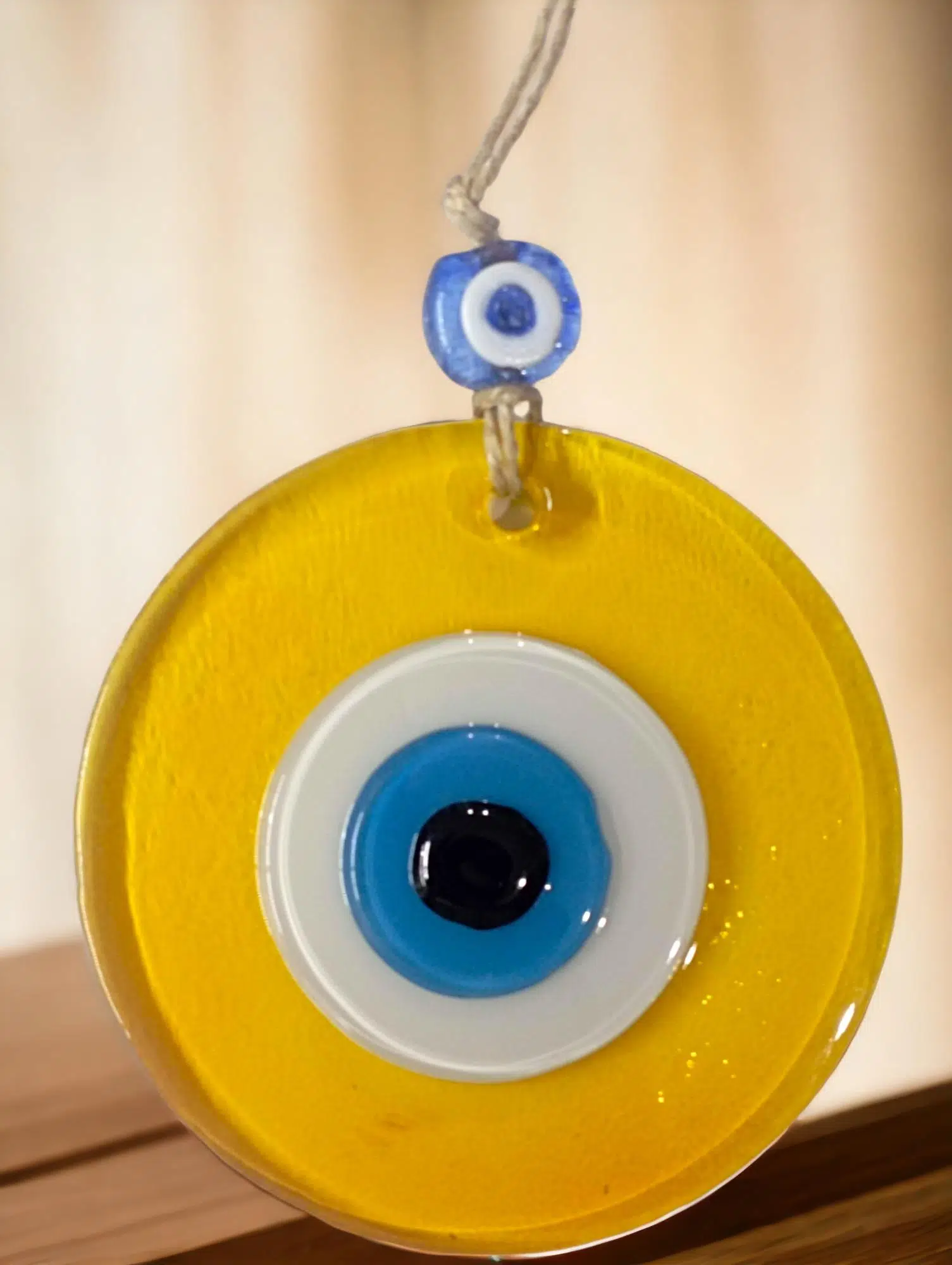 Mini boy şeffaf sarı renk nazar boncuklu duvar süsümüz tamamen el işçiliği ile üretilmiştir. Tasarım harikası el yapımı nazar boncuklu duvar süsümüz 10 x 10 santimetre ölçülerindedir. Ürünümüz ip dahil 23 santimetre boyundadır.