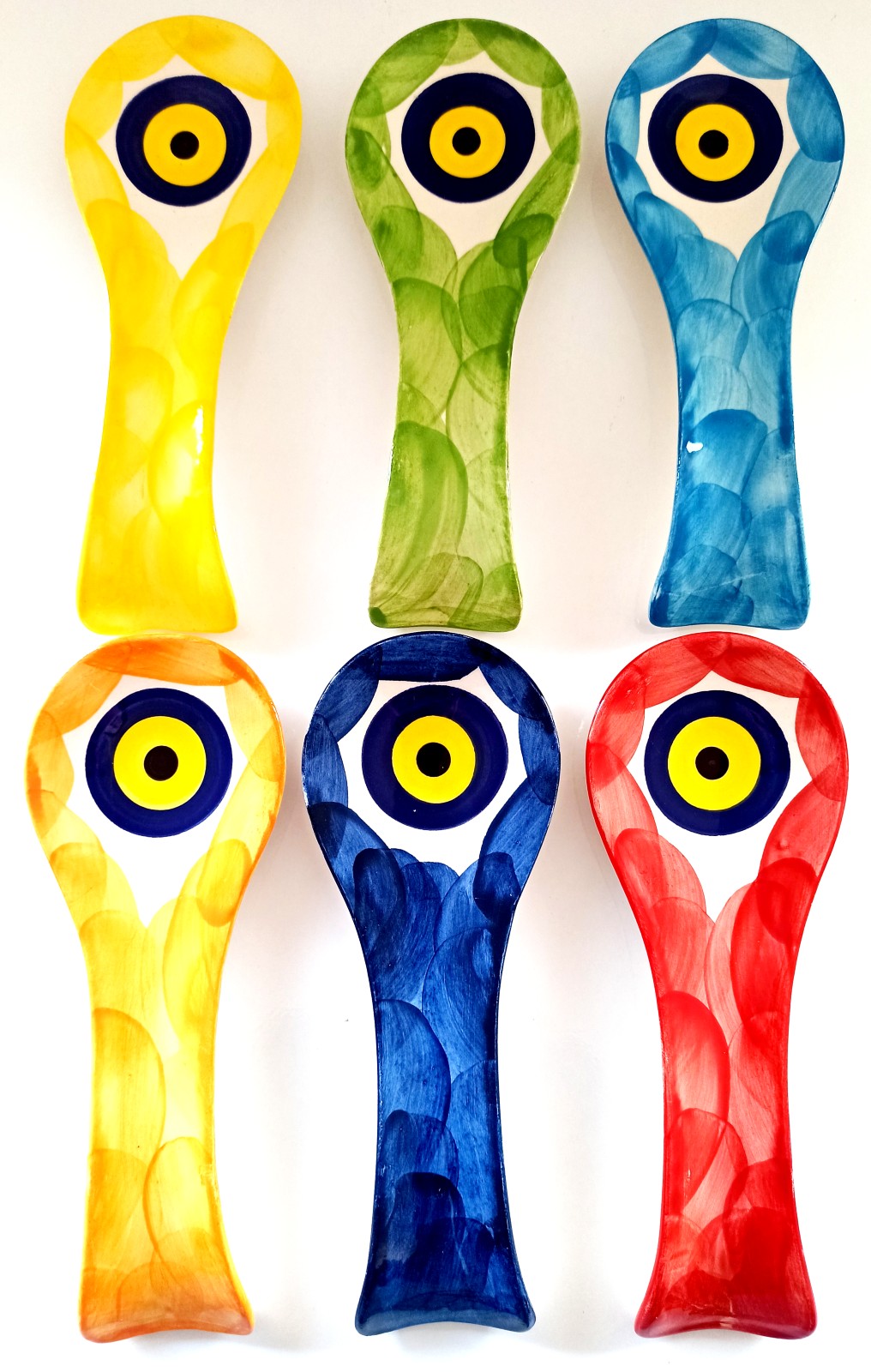 Nazar boncuklu tezgah üstü seramik kaşıklık tamamen el işçiliği ile üretilmiştir. Ürünümüzün her biri 9 santimetre eninde, 24 santimetre boyundadır. Her bir renkten birer adet olmak üzere 6 adet gönderilecektir.