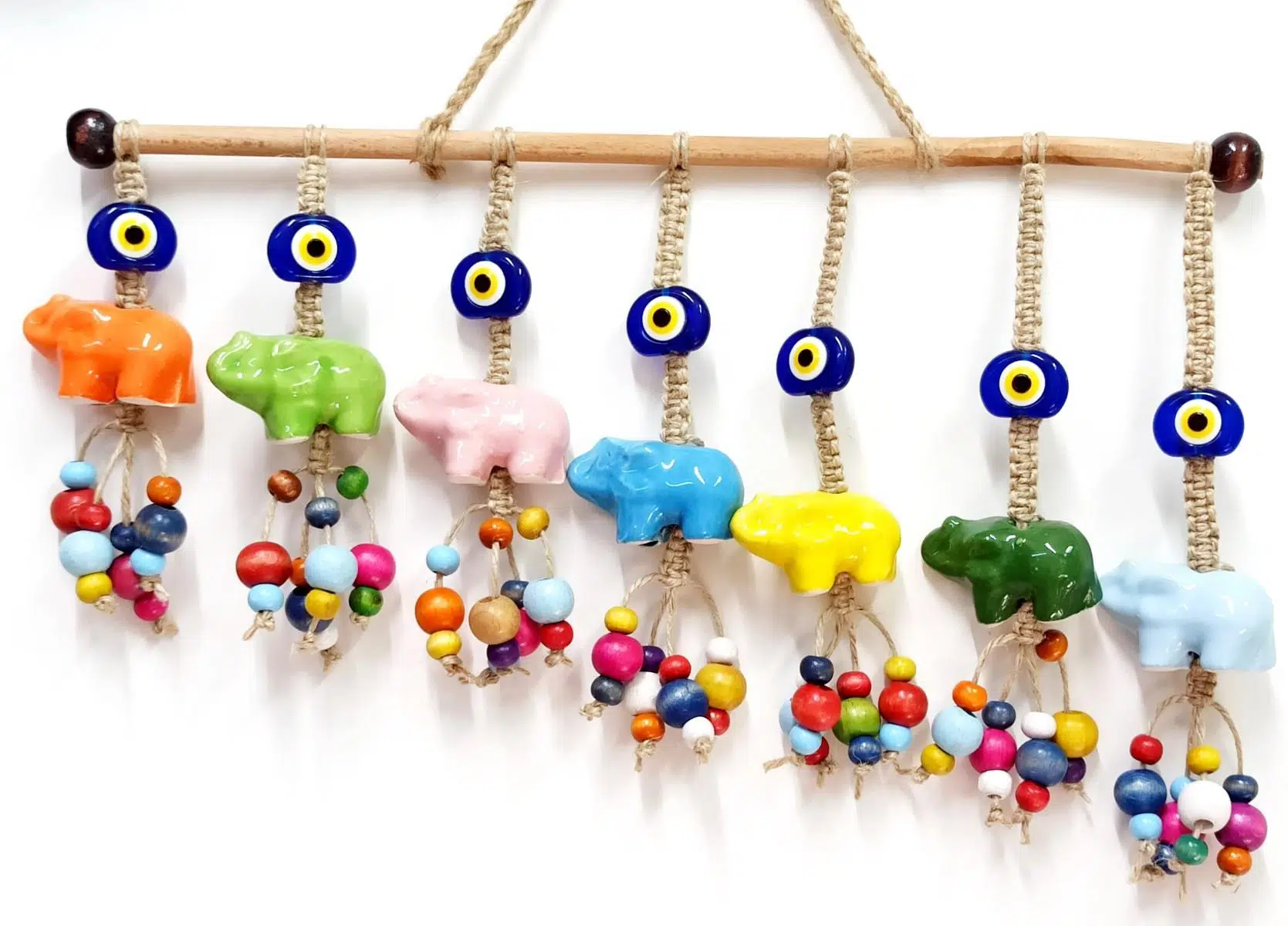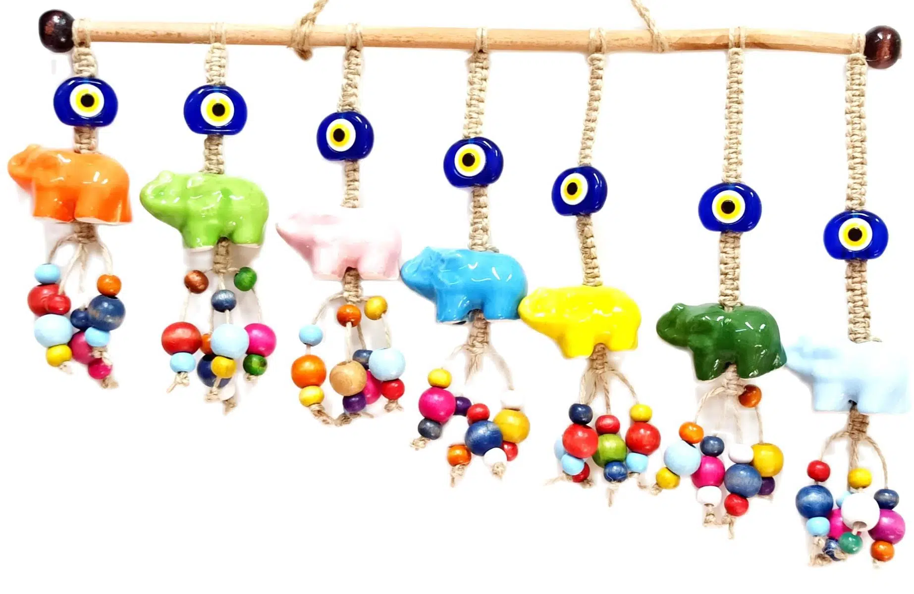 Yedi adet rengarenk seramik fil figürlü nazar boncuklu rengarenk tahta boncuk detaylı kapı, duvar, balkon ve bahçe süsümüz yaşadığı ortamda tarzıyla fark edilmek isteyenler için özel tasarım olarak el işçiliği ile üretilmiştir. Ürünümüz 38 cm eninde 30 cm uzunluğundadır. İster kendiniz için isterseniz sevdiklerinize hediye etmek için tercih edebilirsiniz.
