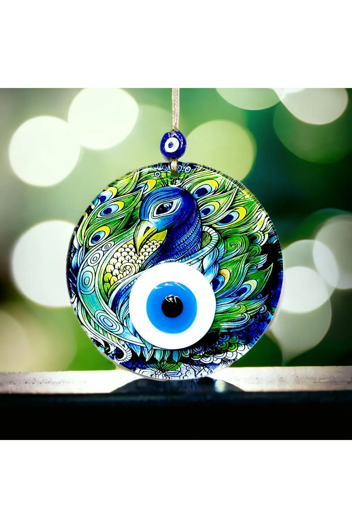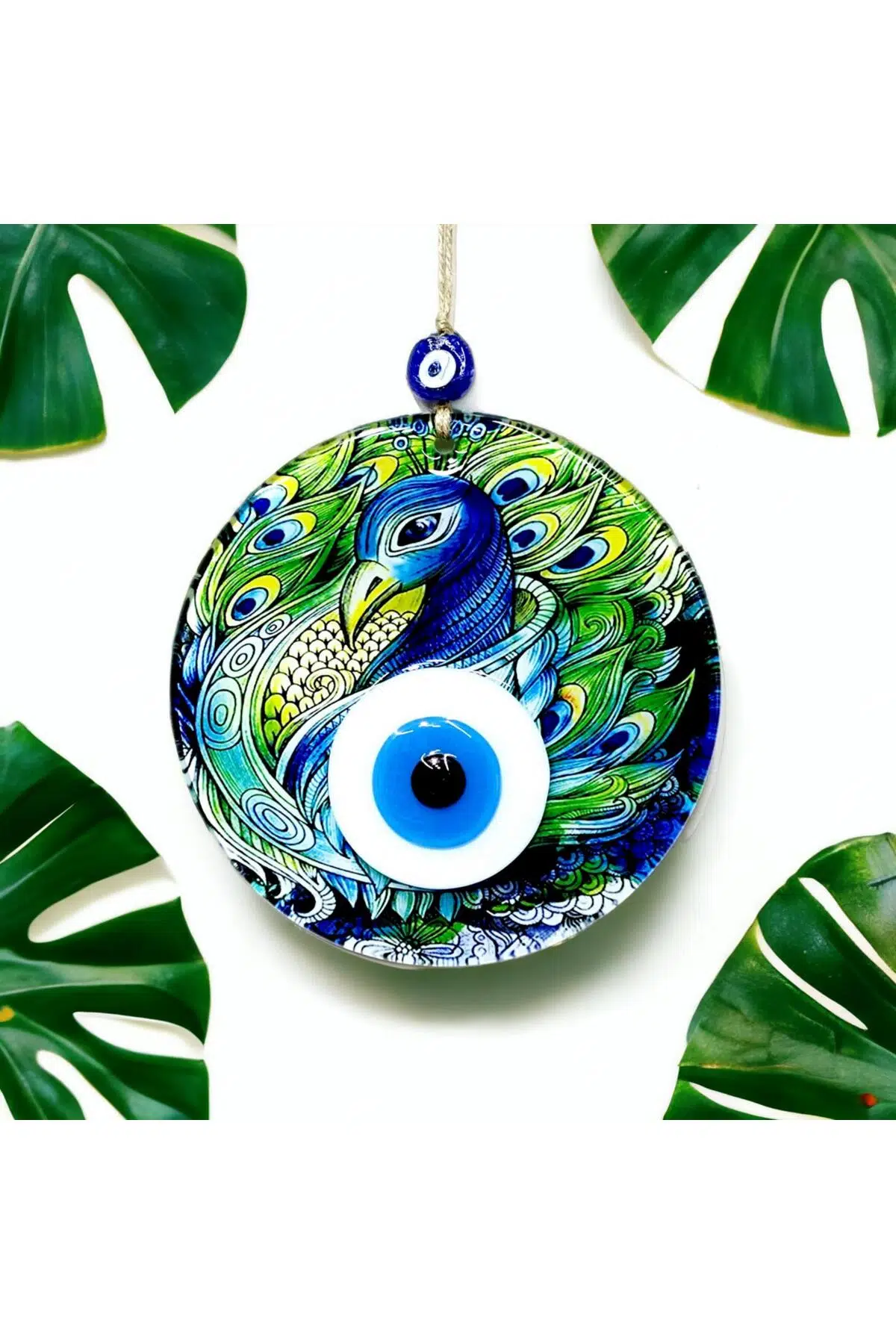 Tavus kuşu desenli ürünümüz 16 santimetre çapındadır. Cam nazar boncuğumuz tamamen el işçiliği ile özel tasarım olarak üretilmiştir. Ürünümüz füzyon cam malzemeden üretilmektedir. Ürünümüzü ister kendiniz için isterseniz sevdiklerinize hediye etmek için tercih edebilirsiniz.