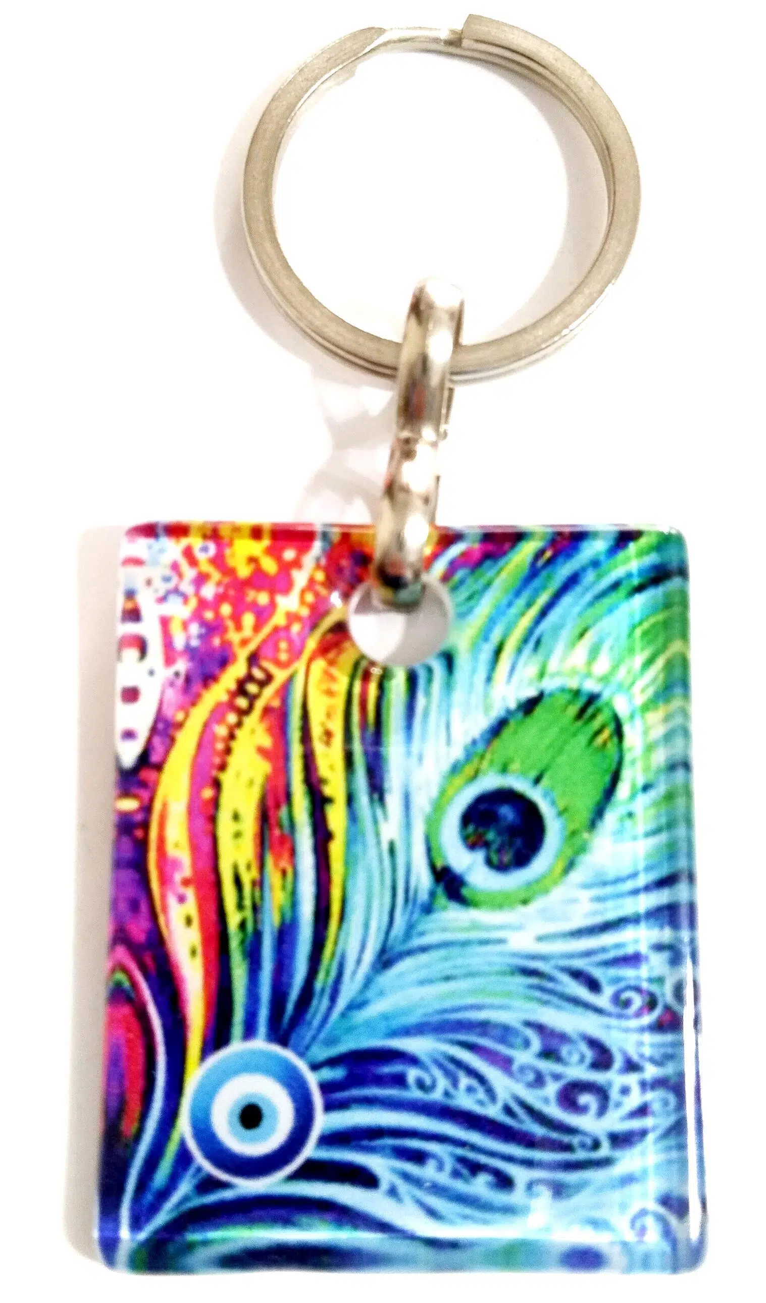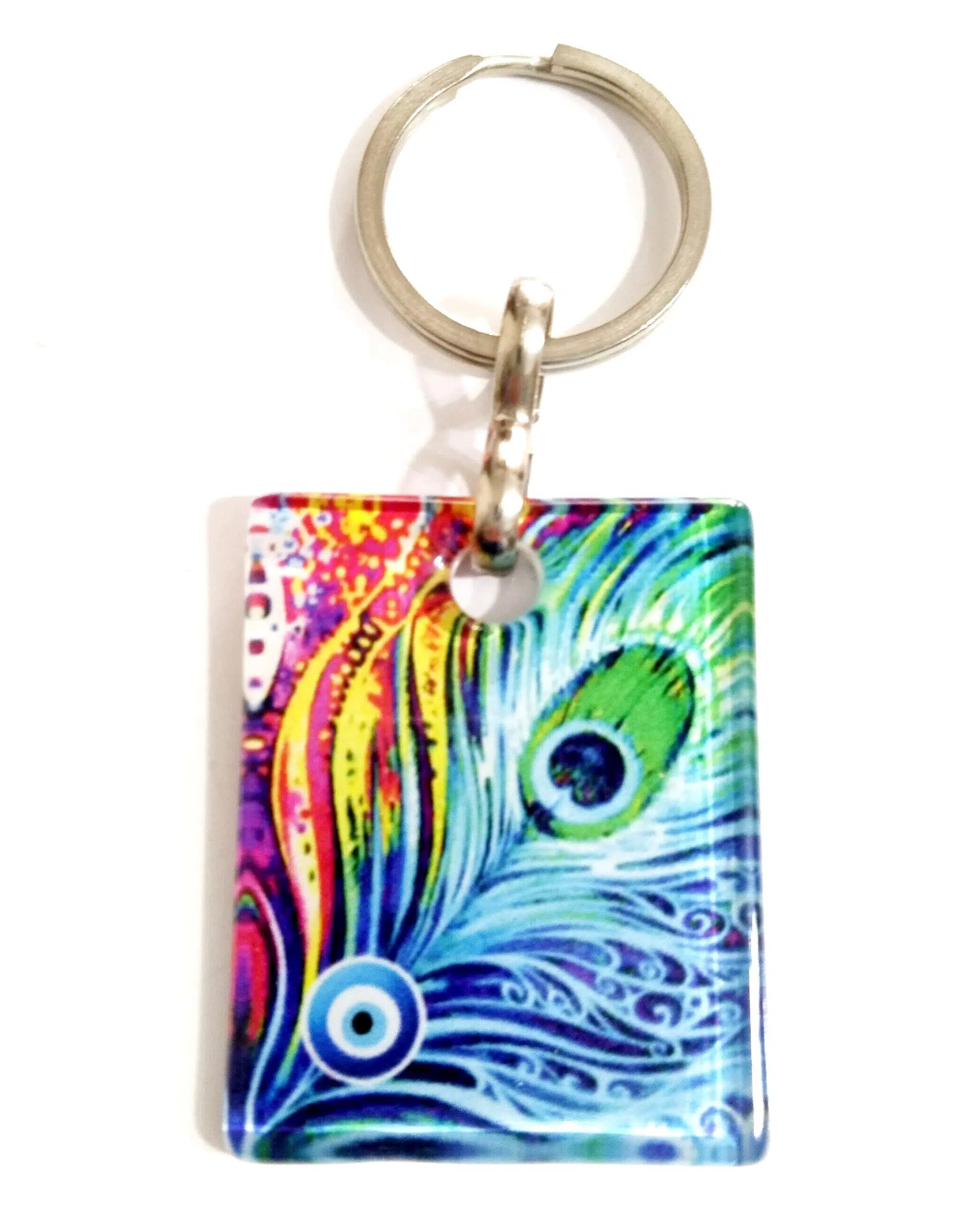 Tavus kuşu tüyü desenli anahtarlığımız füzyon cam malzemeden üretilmektedir. Anahtarlığımızın cam kısmı 4 santimetre eninde, 5 santimetre boyundadır. Ürünümüz metal dahil 10 santimetre boyundadır. Ürünümüz hediye kutusunda gönderilmektedir.