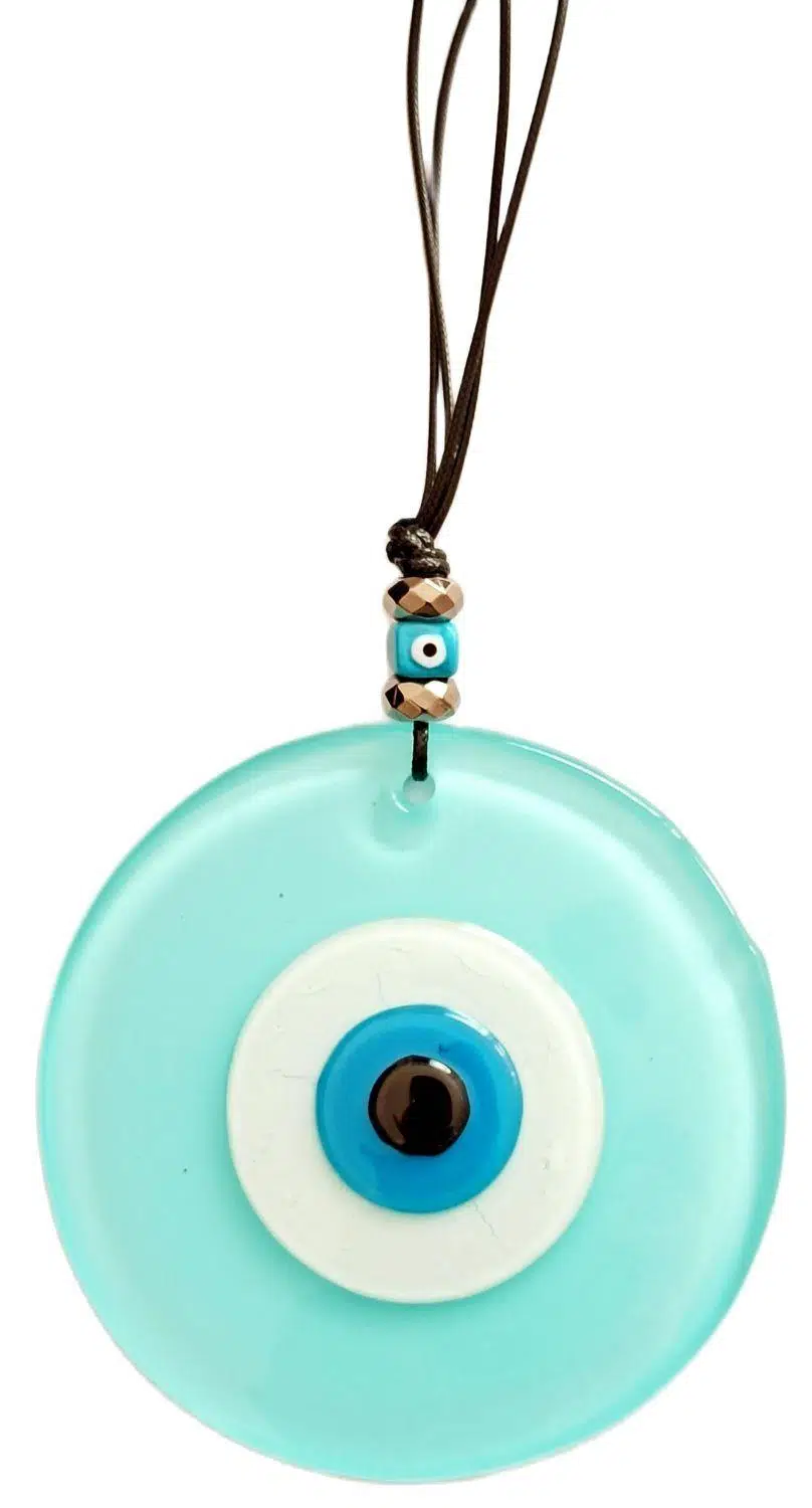 Turkuaz rengi nazar boncuklu duvar süsümüz özel tasarım olarak üretilmiştir. Tamamen el işçiliği ile üretilmiş ürünümüz 12 santimetre çapındadır. Ürünümüz ip dahil 26 santimetre boyundadır. Turkuaz rengin en özel tonlarından üretilmiş duvar süsümüzü ister kendiniz için, isterseniz sevdiklerinize hediye etmek için tercih edebilirsiniz.