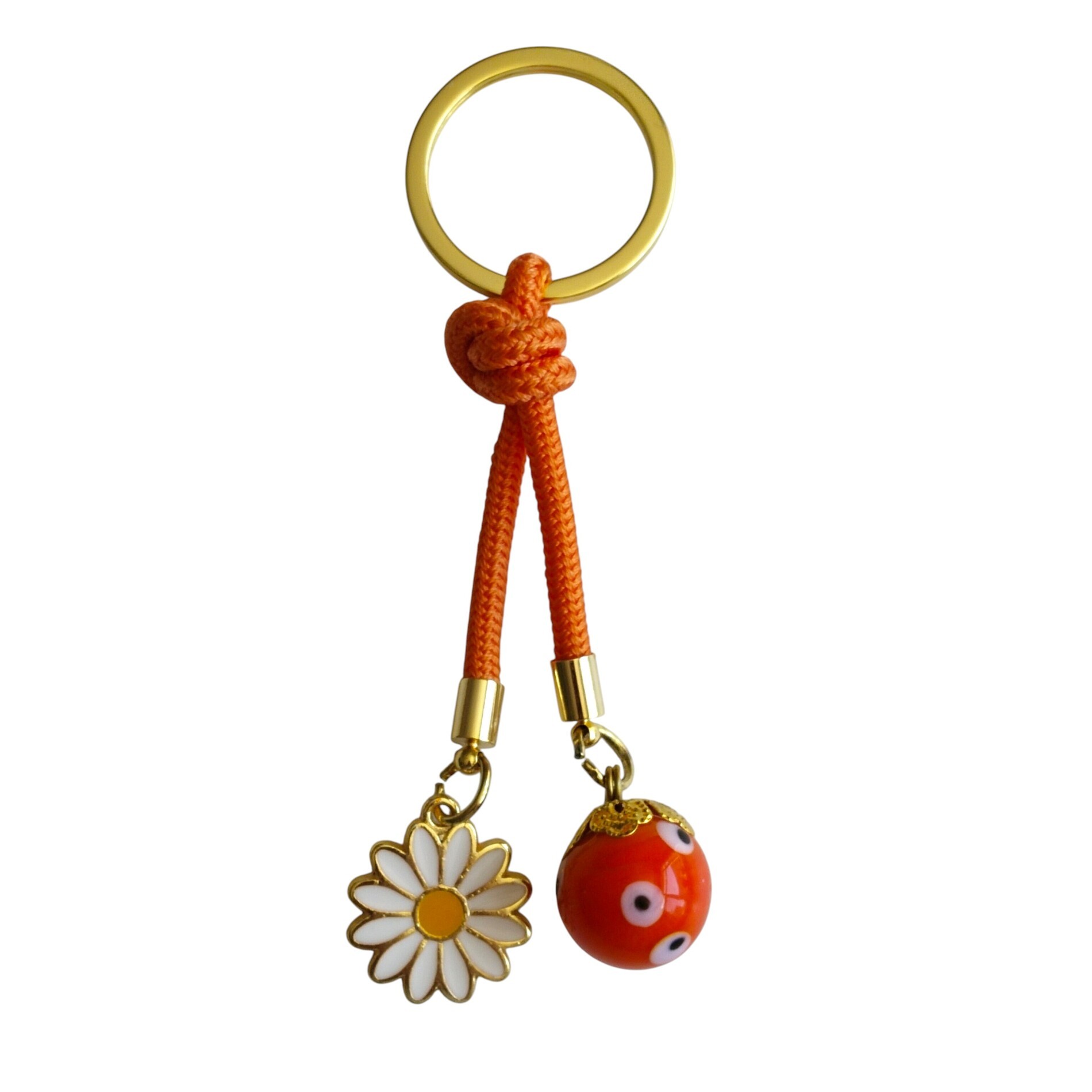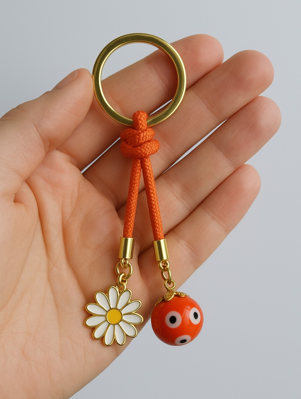 Ürünümüzün üzerinde turuncu bir ip, altın renkli bir halka ve iki süs var — biri beyaz yapraklı bir papatya, diğeri ise nazar boncuğu desenli turuncu bir top.