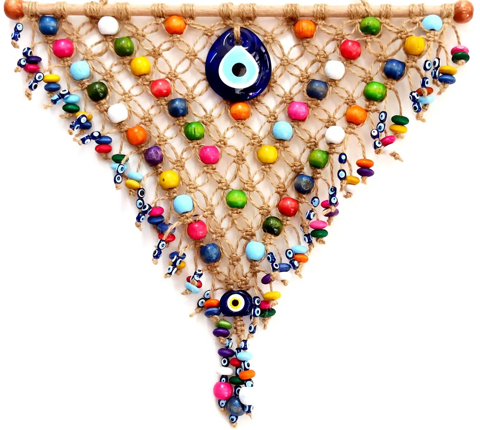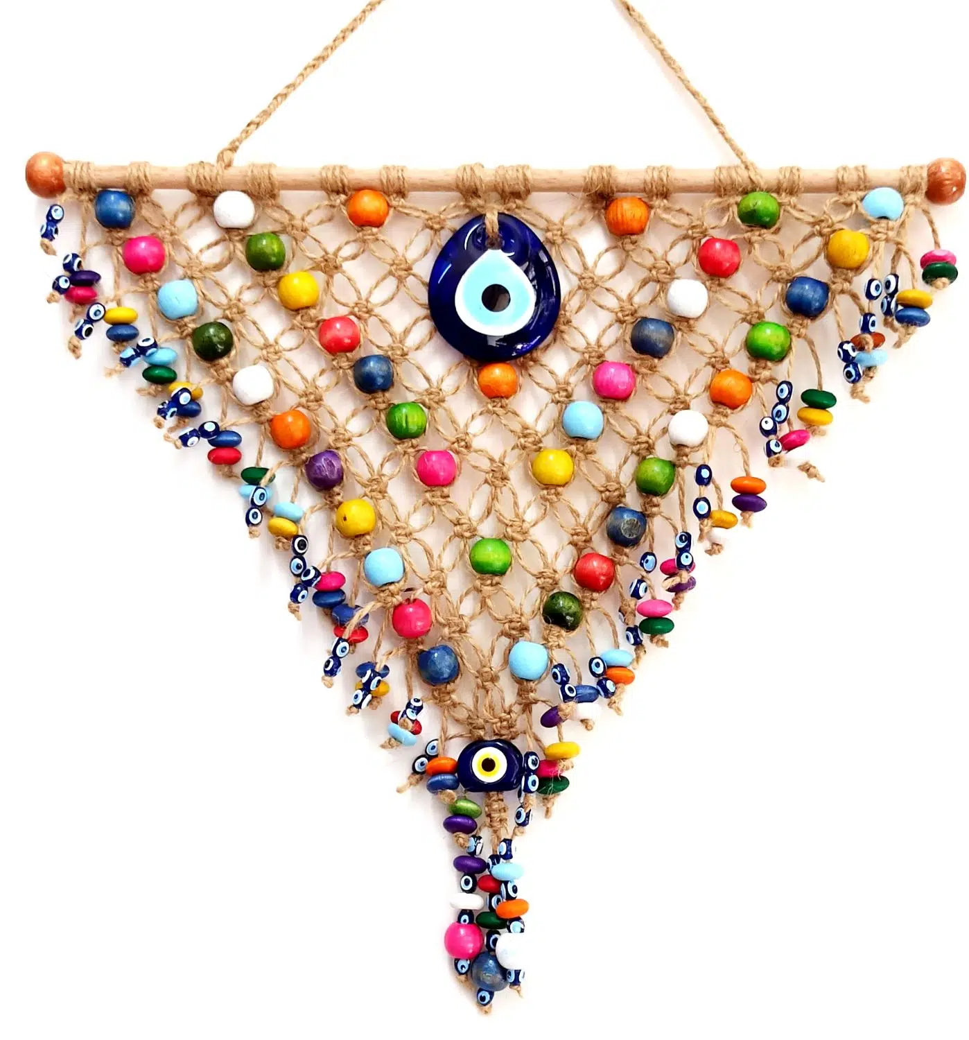 Üçgen tamamen el işçiliği ile üretilen kapı, duvar, bahçe, teras ve balkon süsümüz, kırnap ip, nazar boncuğu ve tahta boncuklardan üretilmiştir. 39x35 santimetre ölçülerinde özel tasarım olarak üretilmiştir. İsterseniz kendiniz için isterseniz sevdiklerinize hediye etmek için tercih edebilirsiniz.