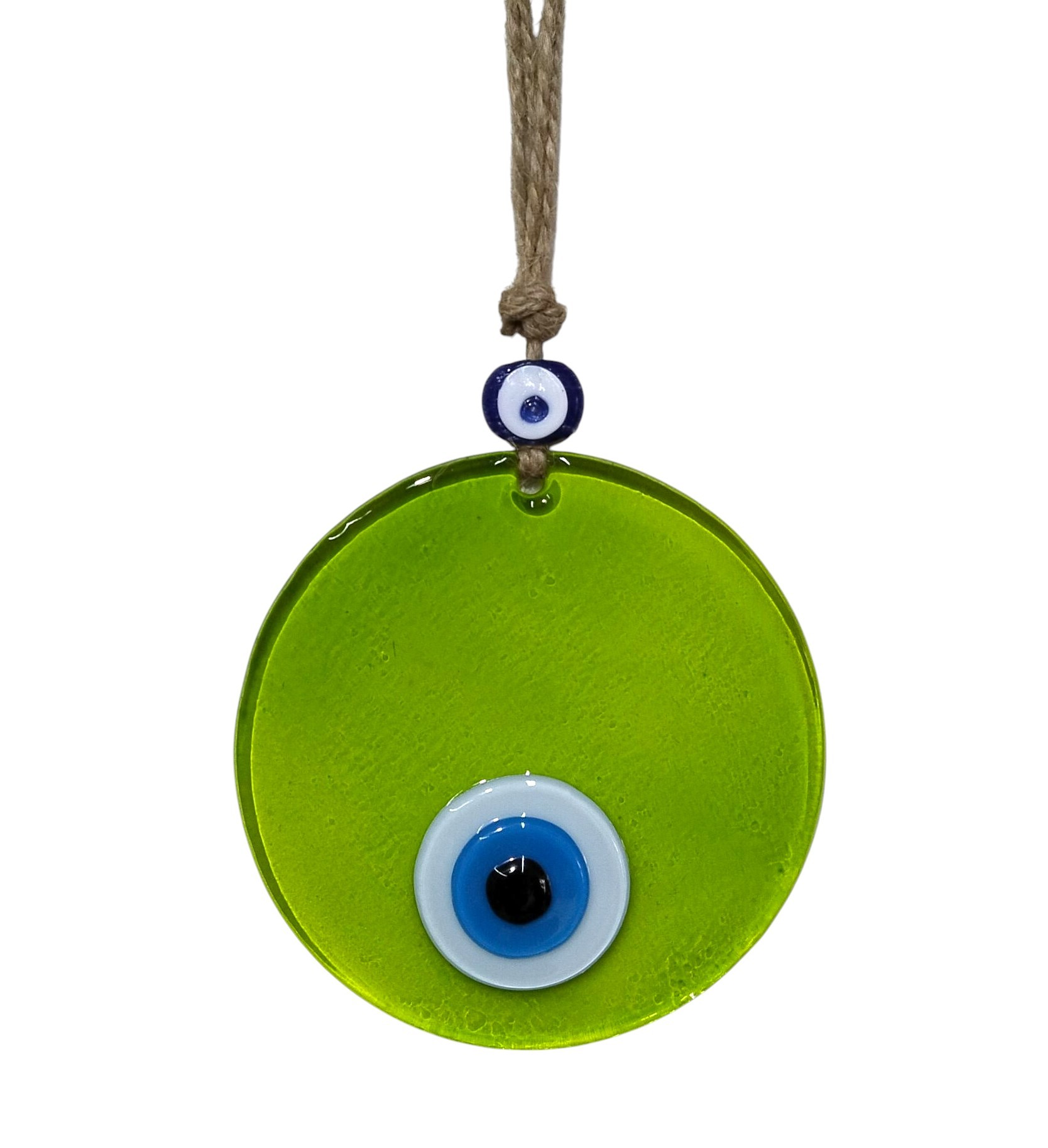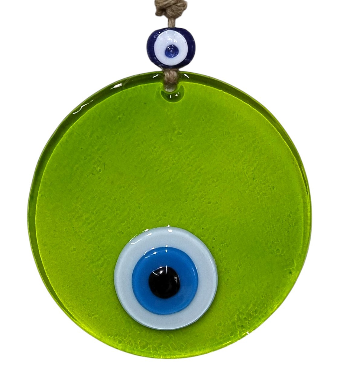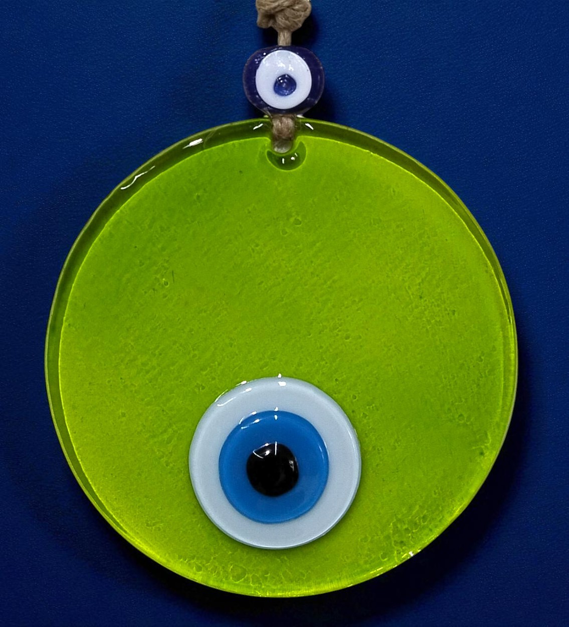 Yağ yeşili renginde nazar boncuklu şeffaf cam ürünümüz 12 santimetre çapındadır. Tamamen el işçiliği ile özel tasarım olarak üretilmiştir. Ürünümüz füzyon cam malzemeden üretilmektedir. Ürünümüzü ister kendiniz için isterseniz sevdiklerinize hediye etmek için tercih edebilirsiniz.