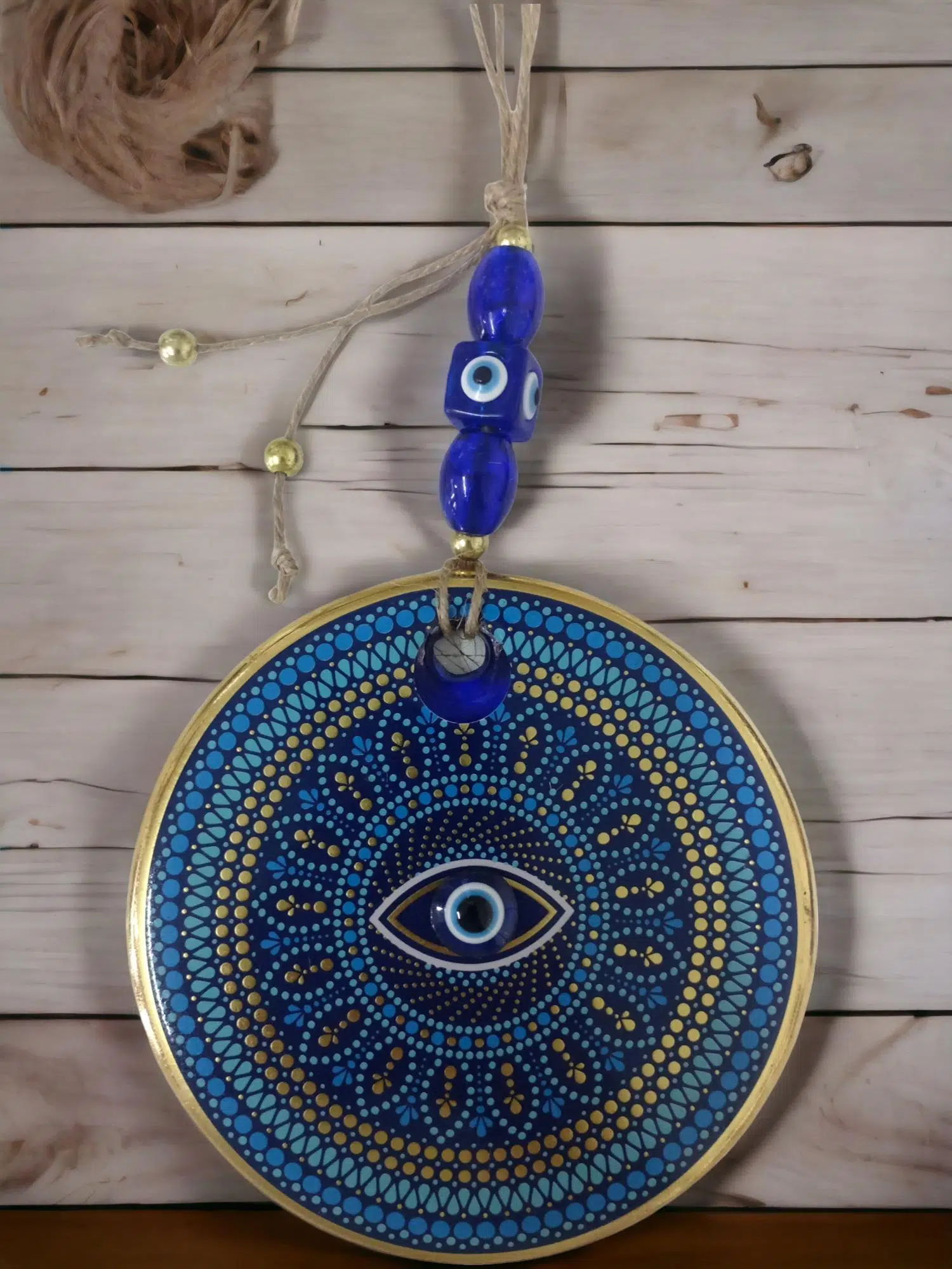 • Nazar boncuklu göz duvar süsümüz nazar boncuğu ile süslenmiştir. Ürünümüz mavi cam nazar boncuğundan tamamen el işçiliği ile üretilmiştir. Ürünümüzün yuvarlak kısmı 13 santimetre çapındadır. Duvar süsümüz ip dahil yaklaşık 30 santimetre boyundadır.