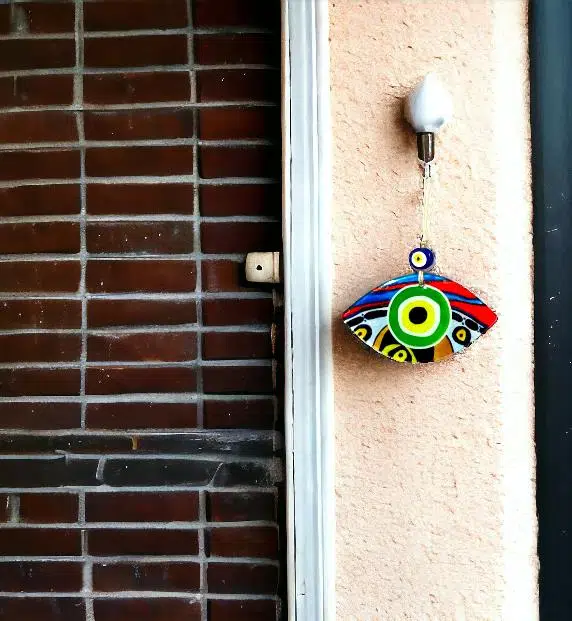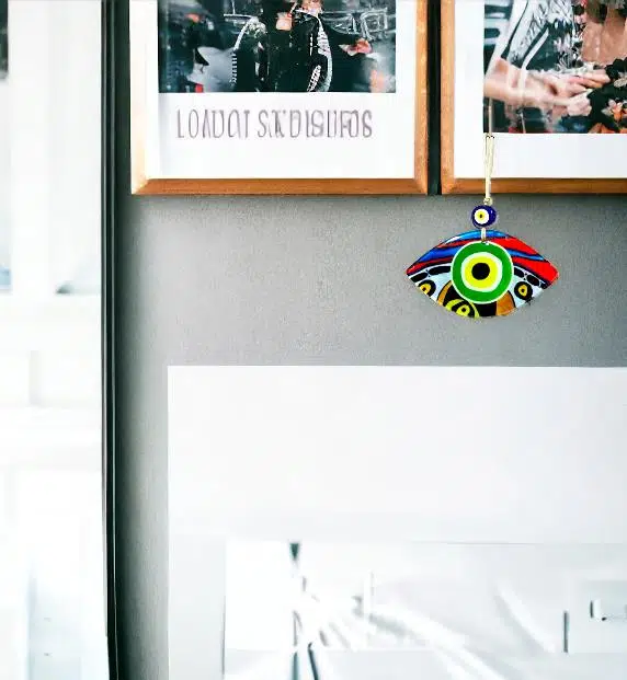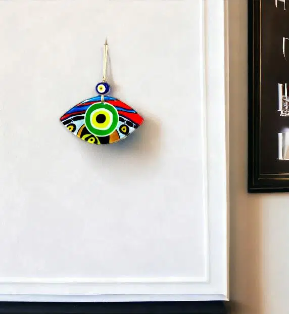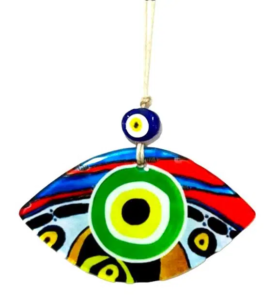 Yeşil göz modelli duvar süsümüz 15 cm eninde, 8 cm boyundadır. Füzyon cam malzeme kullanılarak üretilen duvar süsümüz ip dahil 23 cm boyundadır.