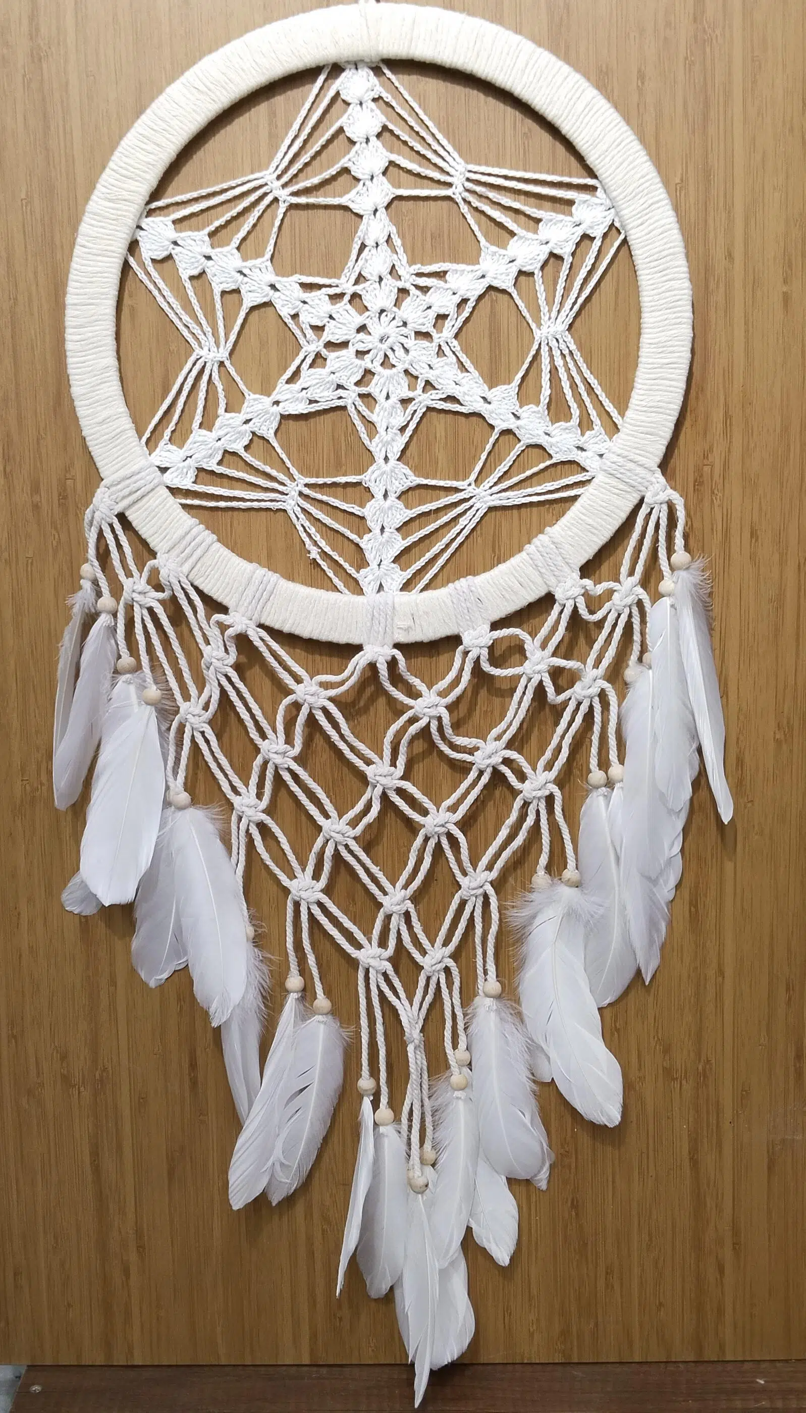 • Duvar süsümüz ekru renktir. Ürünümüzün yuvarlak kısmı 38 santimetre çapındadır. Ürünümüz ip dahil yaklaşık 100 santimetre boyundadır. Ürünümüz tüyler ile süslenmiştir. Ürünümüzde organik doğal ip kullanılmaktadır.